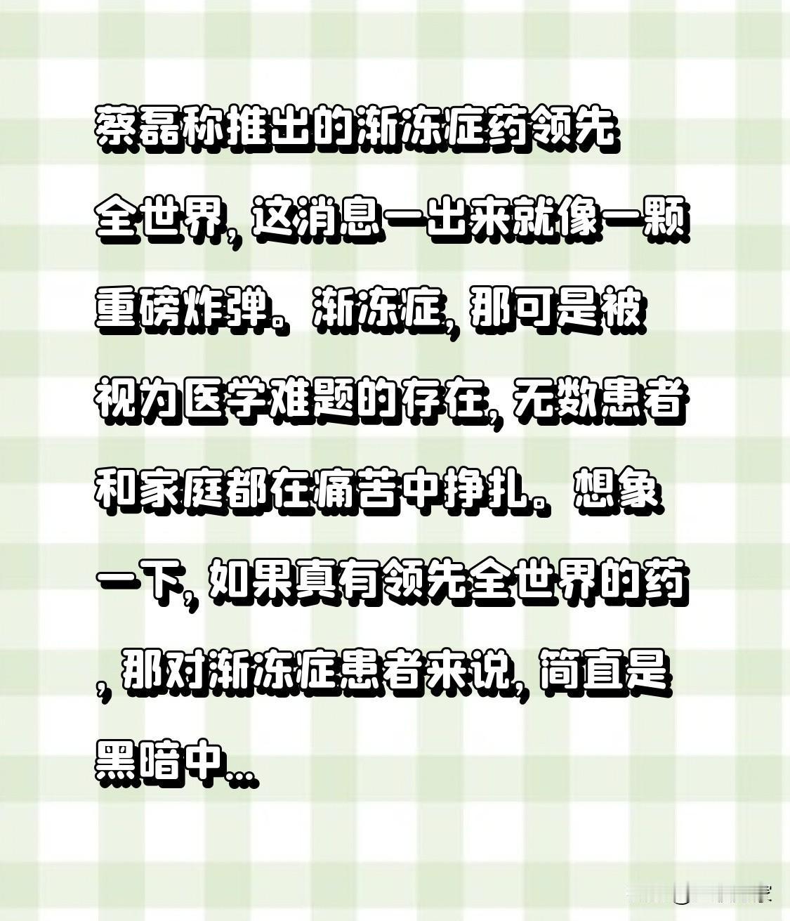 蔡磊称推出的渐冻症药领先全世界,这消息一出来就像一颗重磅炸弹。渐冻症,那可是被视为医学难题的存在,无数患者和家庭都在痛苦中挣扎。 想象一下,如果真有领先全世界的药,那对渐冻症患者来说,简直是黑暗中的一道曙光。蔡磊一直为渐冻症群体努力着,他的团队能有这样的成果,或许能改写无数人的命运。 不过,这药到底效果如何,还得经过时间和实践的检验。医学的进步从来都不是一蹴而就的。 大家觉得这药真能如蔡磊所说的那样吗?渐冻症的治疗未来又会走向何方?你身边有渐冻症患者吗? 渐冻绝症 渐冰症 渐冻群体 渐冻症女孩 渐冻家庭 渐冻症文案 渐冰症 渐冻群体 渐冻症女孩 渐冻家庭 渐冻症文案 渐冻 渐冻症饮食
