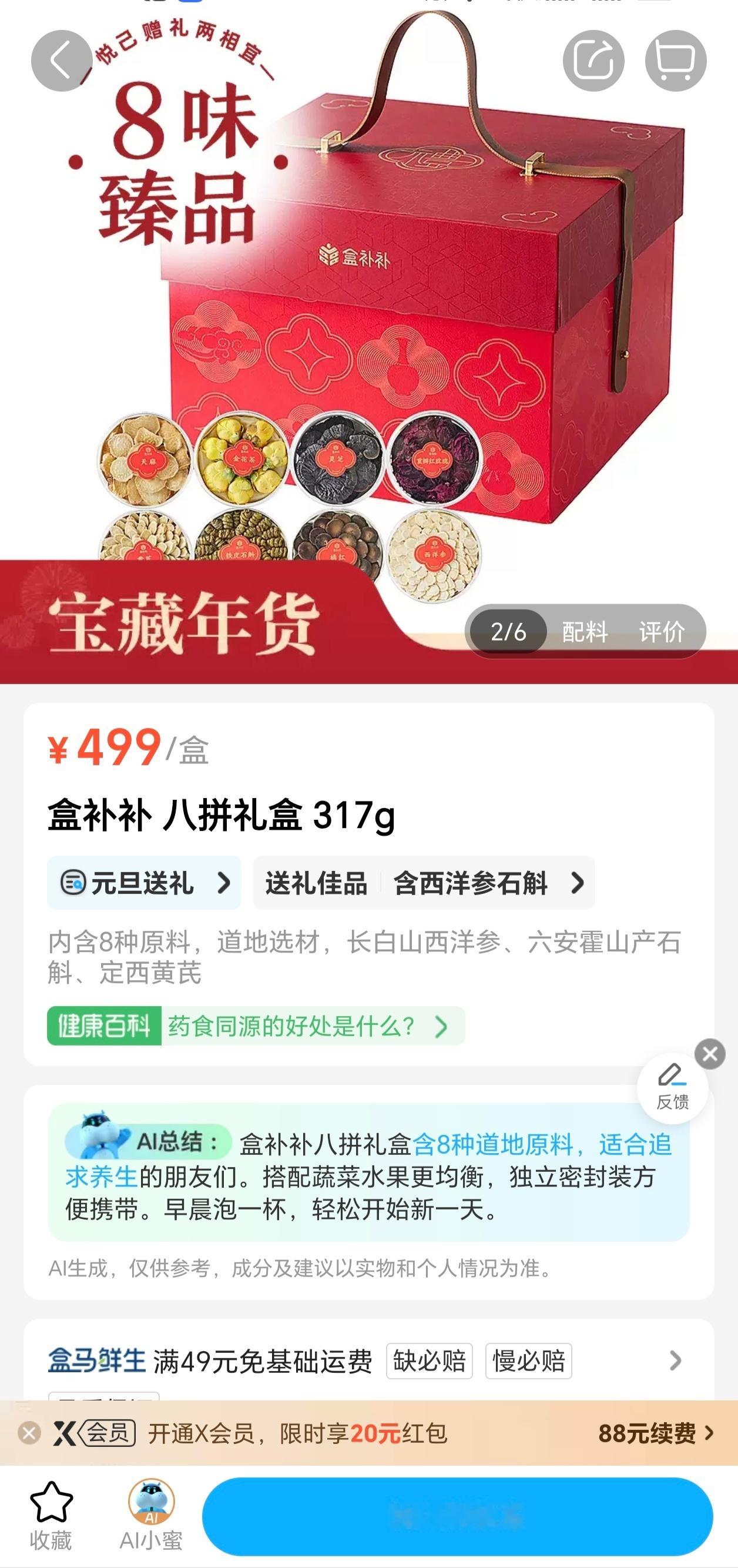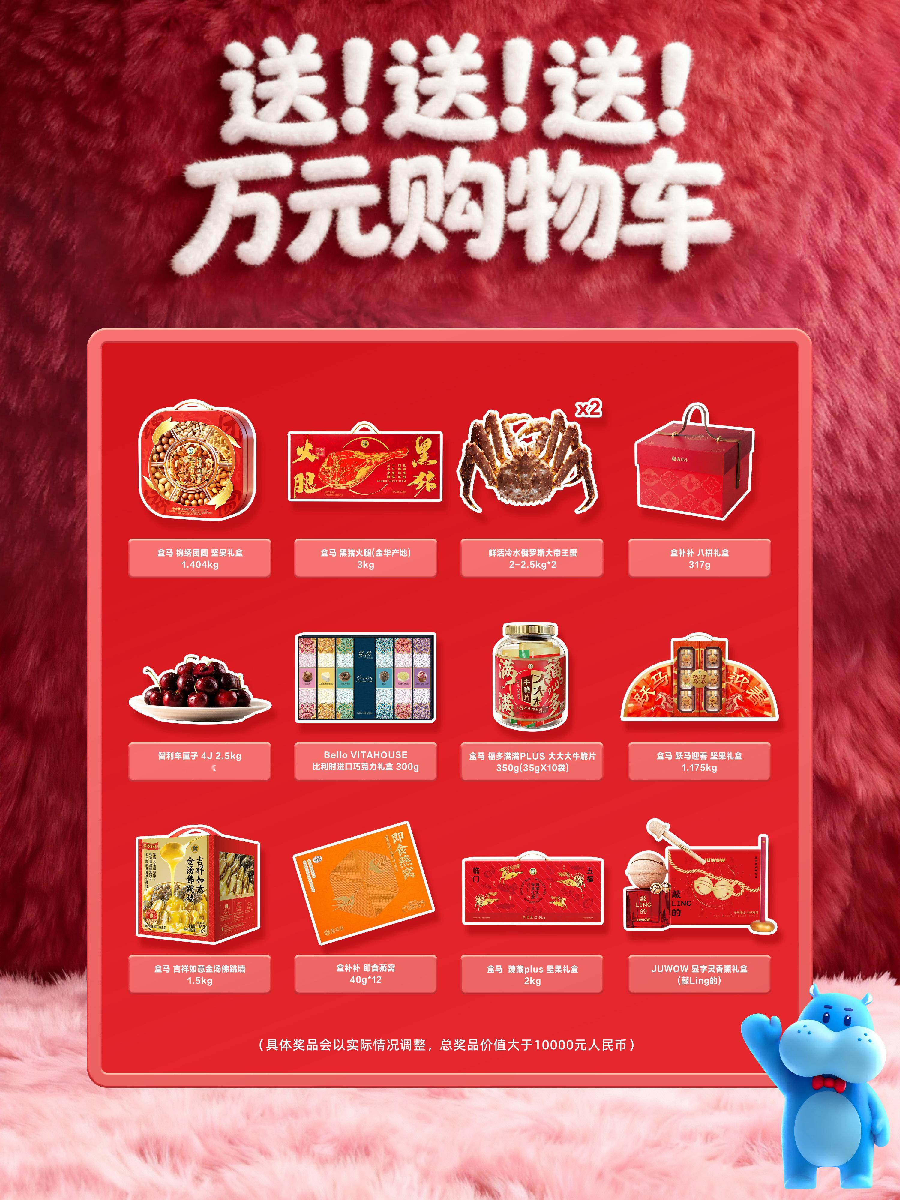 原来这是新型年终奖啊 免费抱走万元年货,这谁能忍住不心动!比起大奖的泼天富贵,大馋丫头更想要万元购物车同款年货谁懂!肉质紧实细腻的盒马黑猪火腿,自然熟成风味一绝!盒补补八拼礼盒更是堪称送礼佳品,地道长白山西洋参、六安霍山产石斛、定西黄芪等,四方好原料一盒拿下!还想0元带走万元年货的家人们务必锁定剩余杭州、成都、北京、合肥四场万元购物车活动!无法到场的uu们也可以在12.29-1.29期间,上盒马搜「加码」最高赢588红包,查收盒马送你的马年红运!盒马年货节