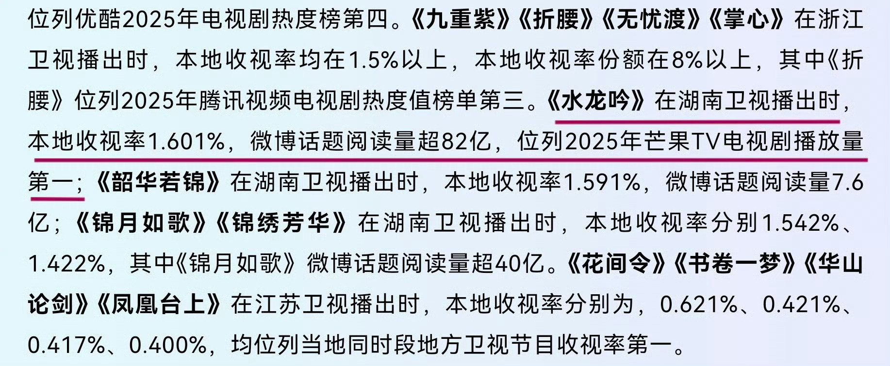 广电认证四大平台年冠 搞不懂,国家广播电视总局在《中国视听大数据(CVB)2025年国产电视剧收视报告》中,明明写得很清楚了,“《水龙吟》在湖南卫视播出时,本地收视率1.601%,微博话题阅读量超82亿,位列2025年芒果TV电视剧播放量第一”,《水龙吟》的芒果年冠,是权威认证的!广电总局出的报告,本该是一场争论的结束,因为它意味着尘埃落地,也意味着花落《水龙吟》!但刚刚刷博,还是会看到一些不甘心的评论,说“《XXXX》不论是XX还是XXX都应该是年冠”,甚至还有一些或刻意或恶意的诋毁言论,我觉得大可不必,权威报告已经一锤定音,真的没必要继续纠缠了,再继续,就酸味太盛了。水龙吟跨年电影愿 广电认证四大平台年冠