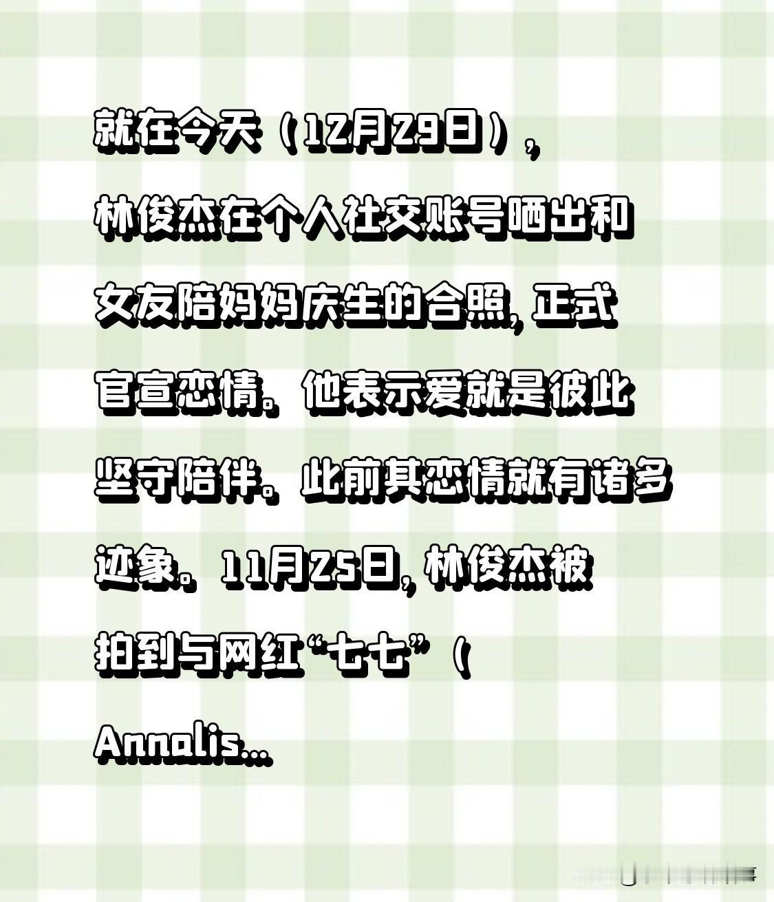 惊爆!今日(12月29日),林俊杰在个人社交账号晒出和女友陪妈妈庆生的合照,正式官宣恋情。他表示爱就是彼此坚守陪伴。 此前,其恋情早有迹象。11月25日,林俊杰被拍到和网红“七七”(Annalisa)在洛杉矶穿情侣装出行,十分亲昵。女方23岁,美籍华裔,比林俊杰小21岁,2024年起多次现身其演唱会VIP首排。