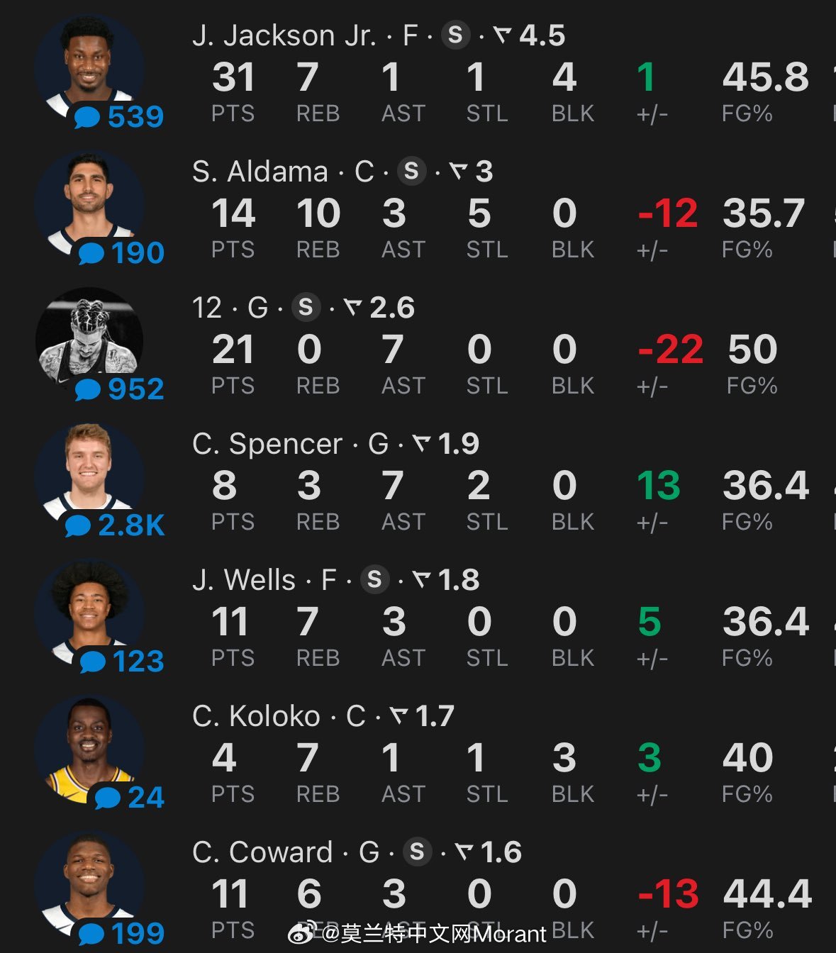虽然灰熊输了,虽然莫兰特正负值-22,但终归表现来说,这场没啥毛病!尽力了!