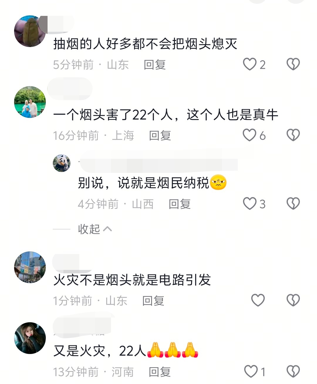 一根烟引起的火灾这可是人命啊,20条人命,这人在干什么,抽完烟不熄灭等着引起大火灾吗,现在的结果满意了啊?每次快过年了就有火灾发生,安安稳稳过个年不行吗,这种人还留着干啥,20多人还等着过年呢,现在团团圆圆不了。网友说🈲烟我觉得确实该禁烟,因为一个烟引起的火灾不是一次两次了。安全无小事,隐患早排查才能防患于未然。