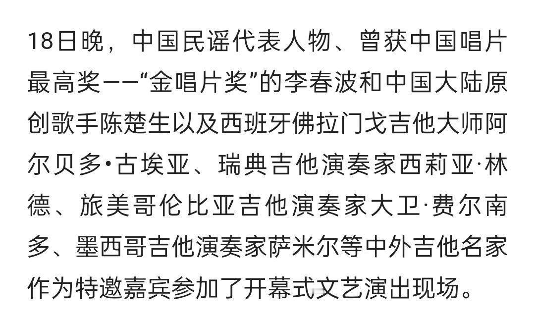 原来陈楚生在节目上说的音乐节30人是个很有含金量的中国吉他文化节。 他有时低调地会把很盛大的事说的轻描淡写,刻意配平兄弟间的各种待遇。 实际上,他重来就没糊过,蘑菇屋期间还忙着巡演。今天🈶网友怕花生朋友们不清楚,特意做了注释: 那个人数不多的音乐活动是【2014年】【第八届中国吉他文化节】,据说是中国最具权威的吉他艺术文化交流活动。