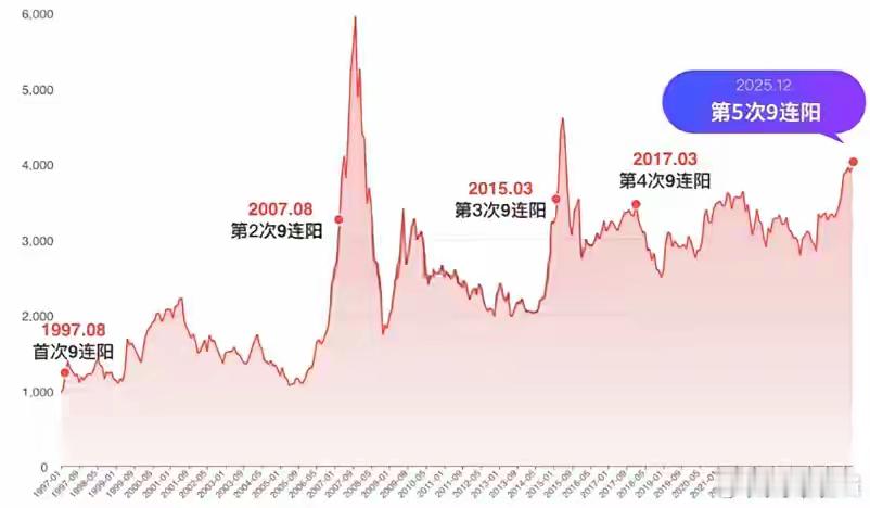 沪指这一波9连阳,虽然涨幅并不大。但意义还是重大的,在A股过去33年历史中,总共才仅5次,平均近7年才出现一次!!第一次,1997年8月20日~9月1日,其后1个月下跌了10.13%。第二次,2007年3月11日~3月29日,其后1个月上涨15.06%。第三次,2015年3月11日~3月23日,其后1个月上涨19.14%。第四次,2017年12月28日~2018年1月9日,其后1个月下跌6.7%。第五次,2024年9月18日~9月30日,其后1个月下跌1.7%。大家应该发现规律了,就是每次9连阳都是在牛市期间。第一次是1997~2021的牛市,第二次是2005~2007的牛市,第三次是2015年的牛市,第四次是2017底~2021初的牛市,第五次是去年924牛市起点,现在时隔一年多,就来了第6次了。这是不是意味着,这一轮牛市会时间更长、涨幅更大呢?历史虽然不总是重复,但总是惊人的相似。
