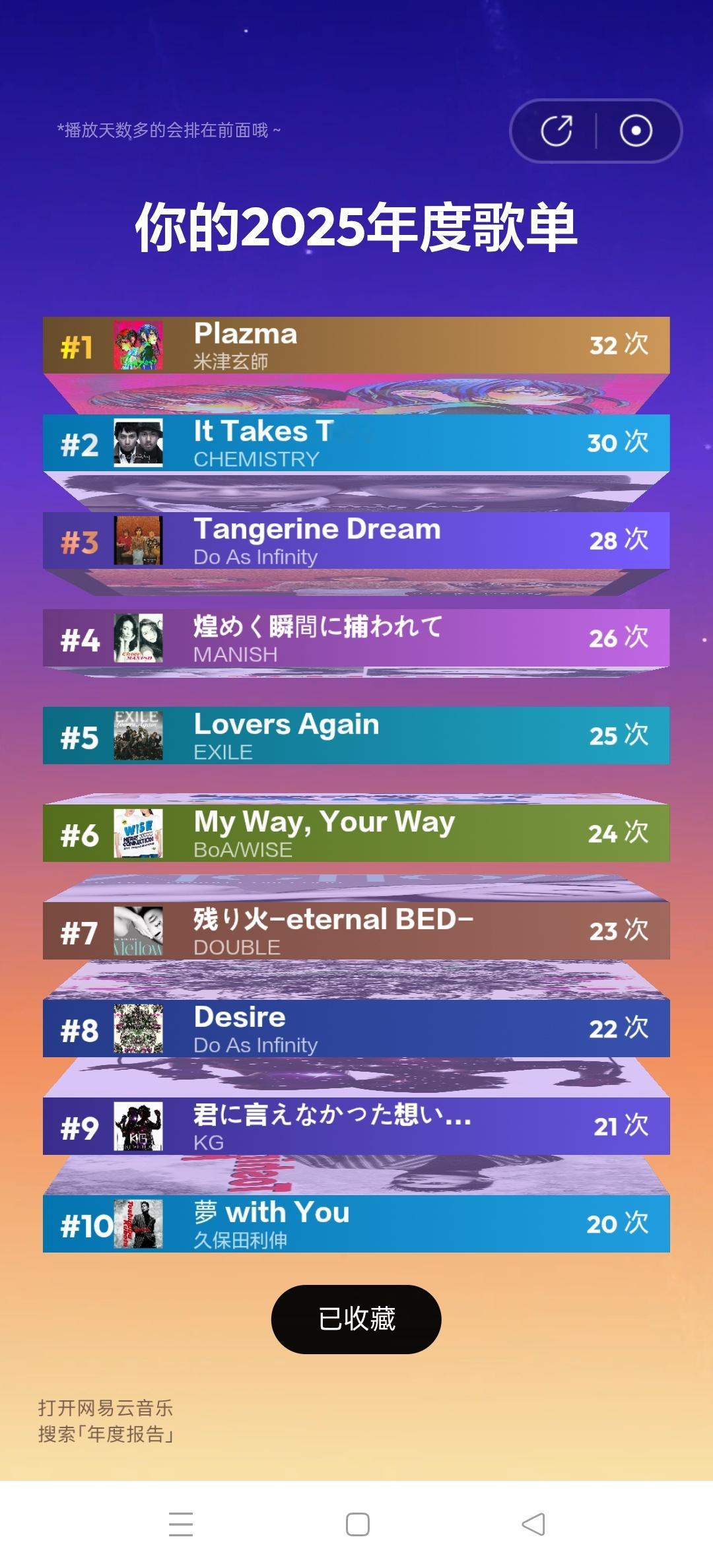 今年的年度听歌报告,基本就是Plazma+民工团+大无限,也补了很多松尾洁+中村仁词曲组合的歌,算是比较怀旧的一年了j-pop