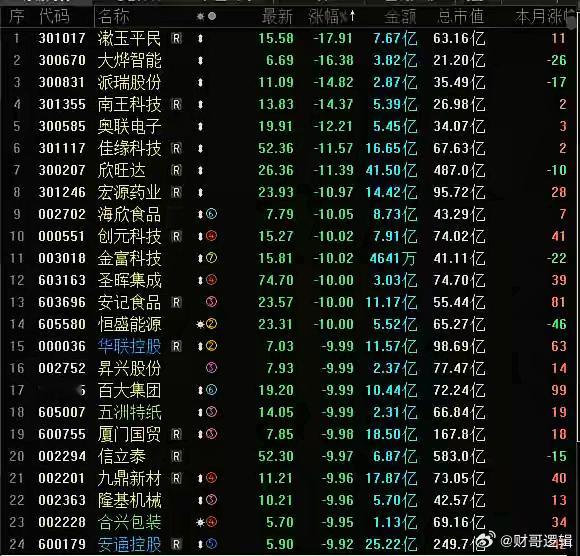 今天A股跌幅榜,24家跌停跌超10%,全A个股涨少跌多,市场个股亏钱效应,个股亏钱效应与指数9连阳背离。跌幅榜跌停股主要集中在近期的高位股,其中消费股,医药股,福建股占据多数,漱玉平民大跌17CM全第一,佳缘科技昨天涨停今天大跌11CM,宏源医药昨天涨停今天大跌10CM,创元科技大跌10CM,圣晖集成大跌10CM,安记食品大跌10CM,华联控股大跌10CM,百大集团大跌10CM,五洲特纸止步3板跌停,厦门国贸止步3板跌停,九鼎新材止步4板跌停。今天的跌幅榜,除了爆炒的商业航天方向的高标继续强势之外,其它方向的高标多数调整,且其它方向高标出来的资金,进入商业航天抱团,商业航天方向整体强度减弱,但核心抱团加强,如总龙头航天发展涨停加速,中国卫星容量百亿成交4连板。按照轮涨,轮跌规律,其它方向亏钱效应,后涨的先跌,接下来先涨的后跌,核心商业航天,接下来调整是大概率,抱团加速,高潮之后就是调整。