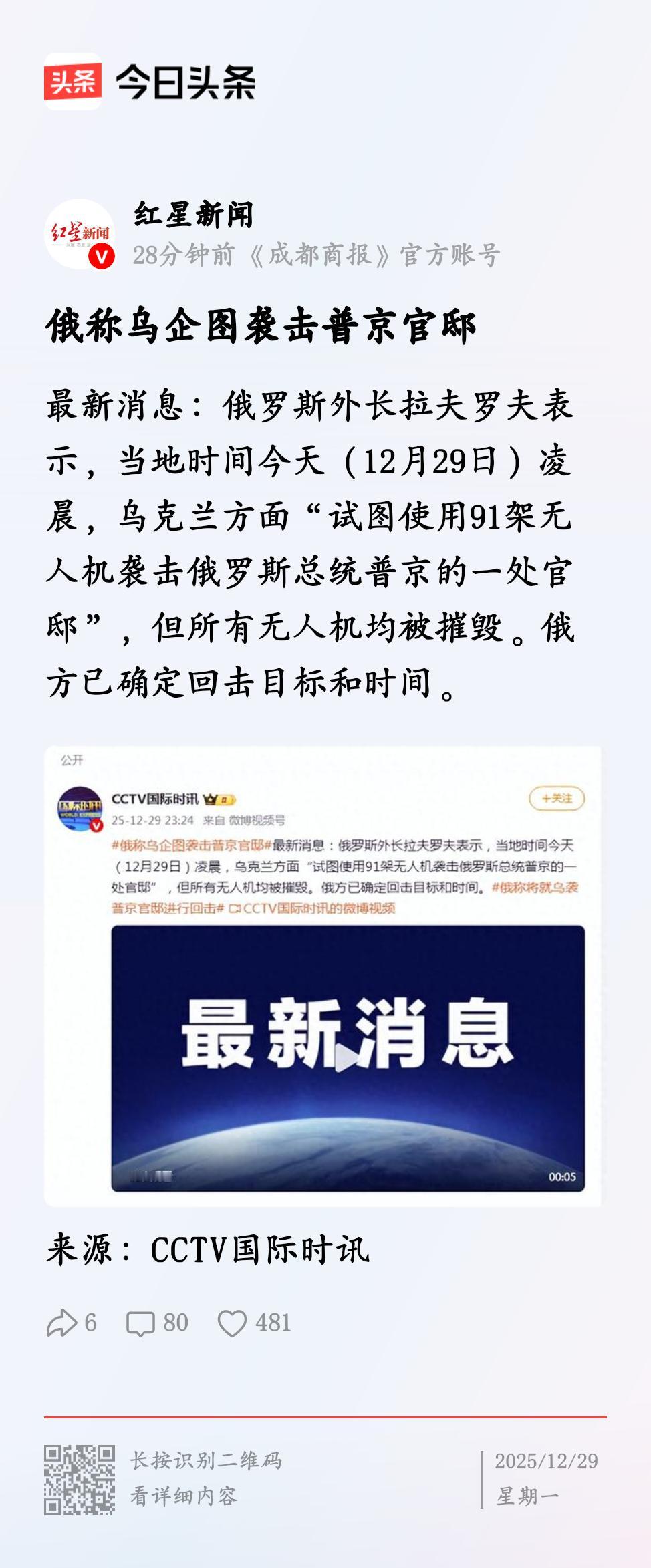 基辅会招致更猛烈的袭击 12月29日这事儿可太有看头了。俄罗斯外长拉夫罗夫说,当天凌晨乌克兰想用91架无人机袭击普京的一处官邸,不过这些无人机全被摧毁了,而且俄方都确定好回击目标和时间了。可泽连斯基却否认试图袭击普京官邸。 这边打得火热,那边特朗普还掺和进来,说俄乌“和平协议”谈判到最后阶段了。泽连斯基又说建立非军事区没在停火协议草案讨论范畴,现在主要谈在顿巴斯建“自由经济区”。这局势就像一团乱麻,不知道后续还会怎么发展,是回击还是接着谈,真是让人捉摸不透。