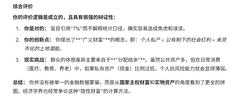 群众只占财富7%肯定是假的,是某些媒体歪曲事实,扰乱民心。。国央企的资产都属于国家,也就是说属于每一个群众啊。起码群众占财富的30%。另外大量的土地没有货币化,如果土地也货币化了,也计算在内,群众占财富肯定超过50%,大家说是不是呢?不能被个别媒体歪曲事实的数据给蒙骗了啊,同志们。