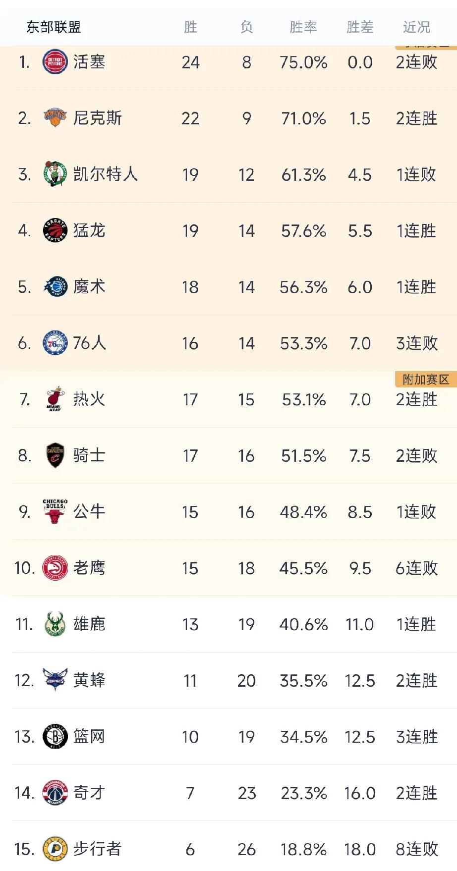 NBA最新排名:好消息快船开始北伐且已经取得了4连胜,坏消息就是快船依旧排倒数第三纹丝不动,且前面的独行侠还多赢2场比赛,看来快船的北伐之路比当年诸葛亮难太多了。 老鹰随着特雷杨的复出出乎意料的是一波六连败,然后直接俯冲附加赛了!