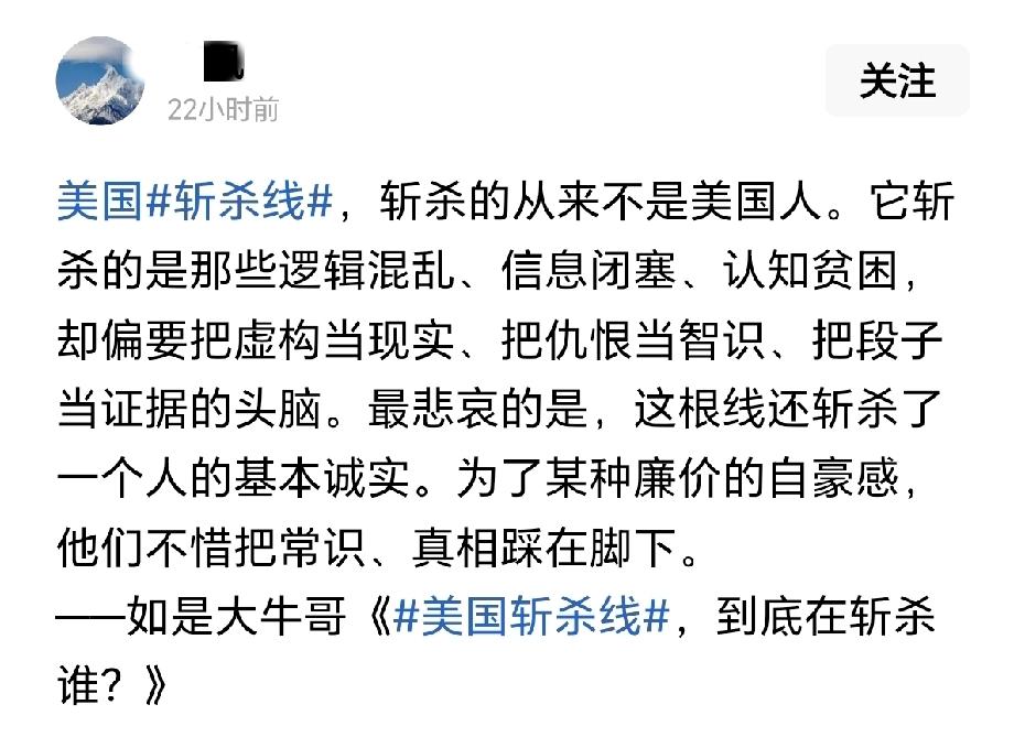 斩杀线火了,有些人急了! 我们对美国人民从来没有仇恨,何来把仇恨当智识?斩杀线真实存在,何来把虚构当现实?把段子当证据? 其实我们从来没有真正的想要去关心美国人民到底怎么样,毕竟各家自扫门前雪,美国人民过得好不好那是他们的事。 我们只是希望某些媒体和某些人不要继续误导我们外国月亮更圆。 美国斩杀线
