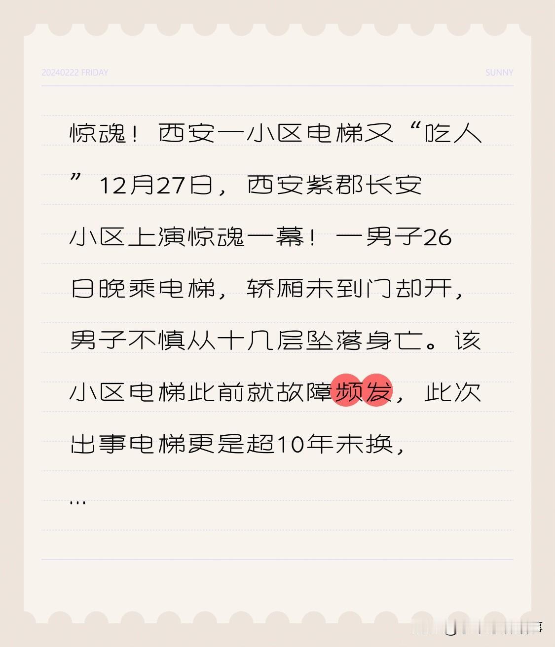 惊魂!西安一小区电梯再“吃人” 12月27日,西安紫郡长安小区惊现惊魂场景!一男子26日晚乘电梯,轿厢未到门先开,不慎从十几层坠落身亡。该小区电梯此前故障不断,出事电梯超10年未换,12天前刚保养。相关部门已成立调查组,责令停梯全面排查。生命安全无小事,电梯安全需重视,盼调查结果早公布! 电梯间惊魂一幕 电梯悲剧 电梯坠落