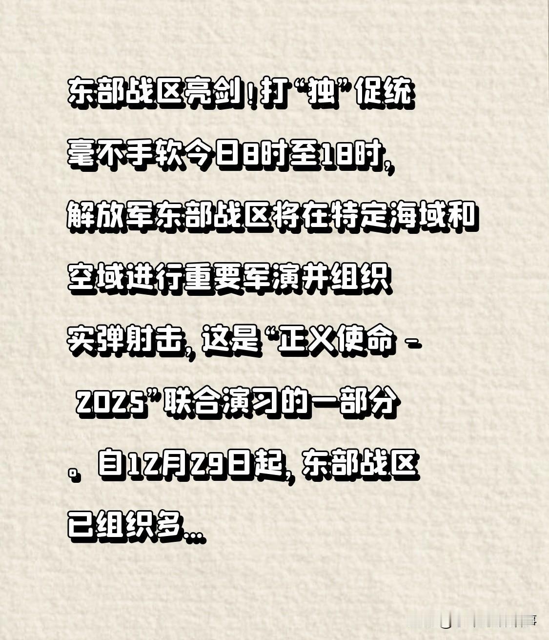 东部战区彰显实力!打击“台独”、促进统一毫不留情 今日8时至18时,解放军东部战区于特定海域和空域展开重要军演并组织实弹射击,此为“正义使命 - 2025”联合演习的一环。自12月29日起,东部战区多军种兵力在台海及台岛周边演习,练海空警巡、夺综合制权等科目。打“独”促统绝不手软,捍卫主权领土完整!台湾岛周边军演 中国战区 硬核东部战区