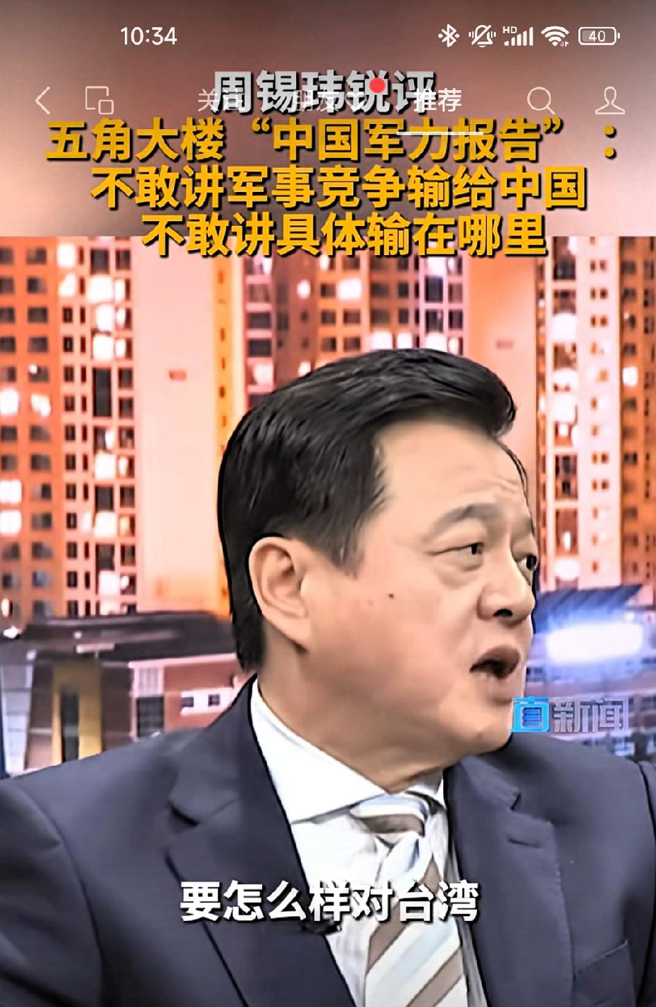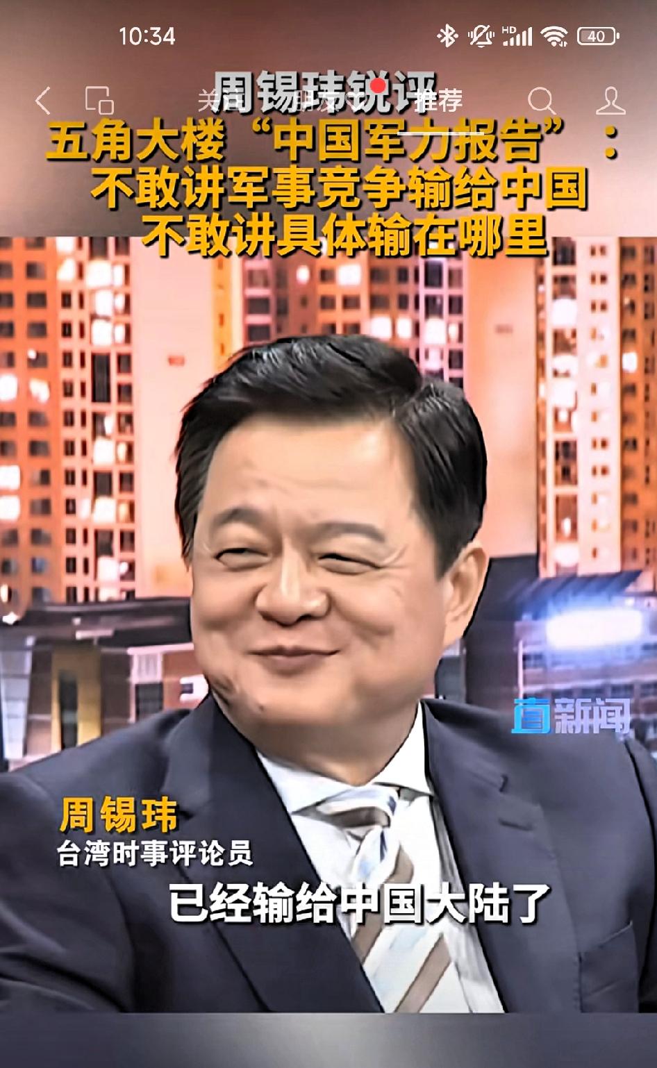 周锡玮锐评:五角大楼“中国军力报告” 第一 美国已经不敢讲他的军事实力输给中国大陆了,不敢讲事实。 第二 美国已经不敢讲他的军事赢在哪里,输在哪里,不敢讲具体细节优势和劣势。 第三 美国已经没有具体的建议和对策了,只表明了不知道中国大陆对台湾的策略? 这就告诉了全世界,美国对中国大陆的军队和政治家,他们的策略和想法,他们的“孙子兵法”全都不知道。