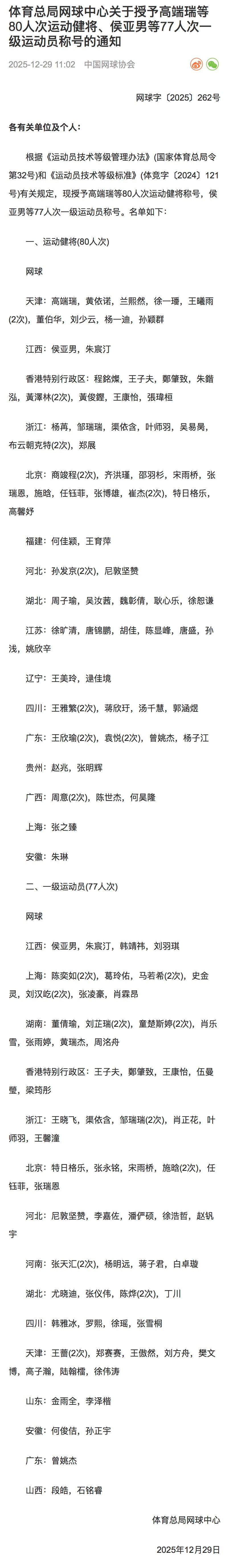 国家体育总局网球中心公布今年各省市运动健将、一级运动员评级名单🎾🇨🇳体育大赏我的年度赛场记忆