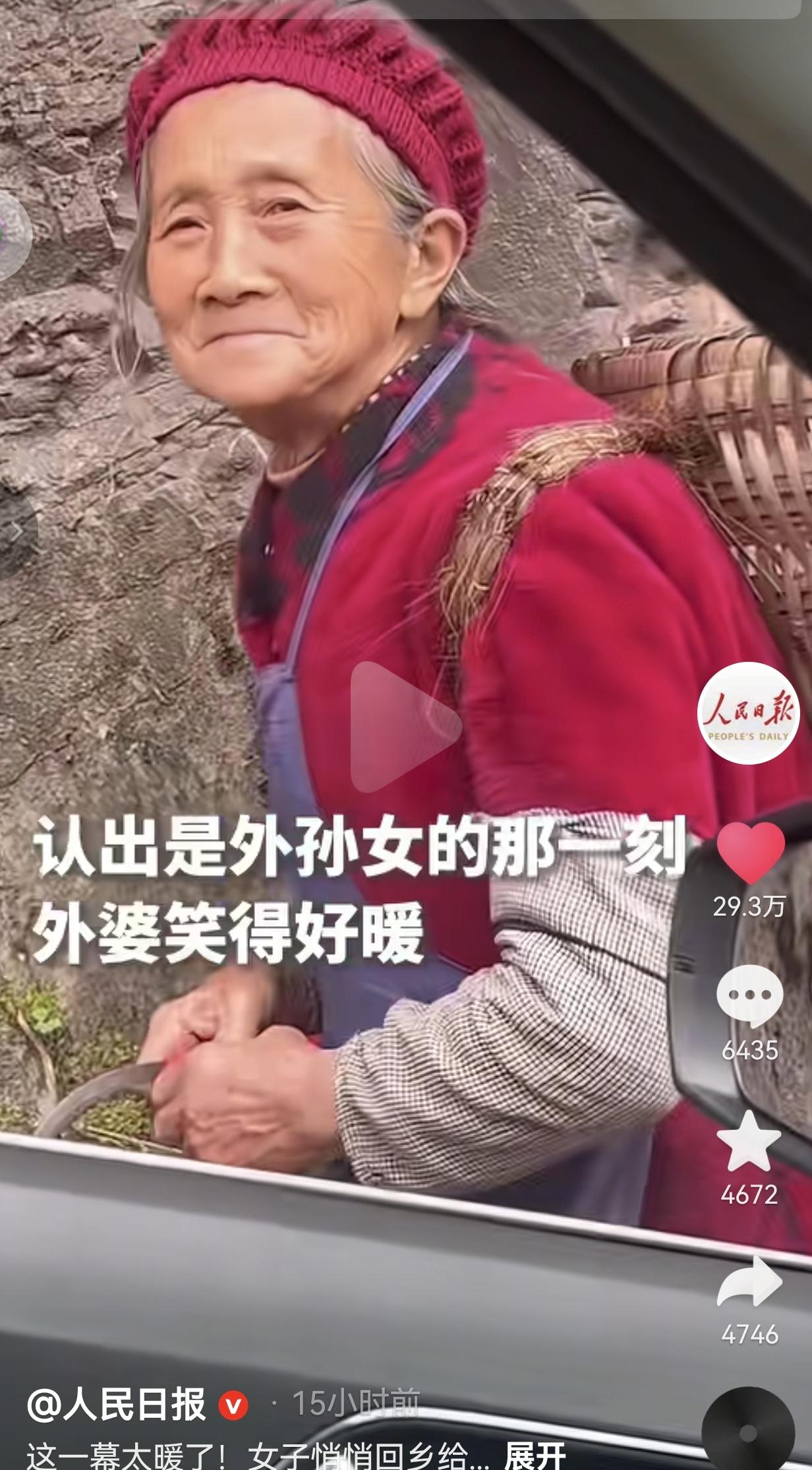 上人民日报了!四川宜宾的乡间小路,外婆贴着土墙小心翼翼侧身让路的模样,戳中了多少人的柔软之地。 外孙女悄悄回村,开车撞见外婆的那一刻,老人下意识站在路边小心翼翼地让路,这一幕成了天底下最软的画面。 女子看到是外婆,就大声呼喊外婆。等老人认出是自家娃,外婆脸上露出久违的笑容,这一幕太温馨了! 有网友看完红了眼眶:“外婆的侧身,是刻在骨子里的温柔啊!” 这一让一笑之间,藏着老一辈人刻进骨头缝里的谦卑。老话说“老辈人把心掏给晚辈,还怕烫着对方”,他们总爱把自己放得低低的,碰见生人会避让,对着晚辈会迁就,哪怕面对最亲的孩子,也揣着一份“怕添麻烦”的小心思。 外婆这一躲,哪是啥怯懦,分明是走过大半辈子风雨后,对这世界最熨帖的体谅。 有网友在评论区念叨:“我奶奶也是这样,见谁都先退一步,总怕自己碍着别人的路。” 而那瞬间绽开的笑容,更是把隔代亲的情分,展现得透透的。“ 隔代亲,亲又亲,打断骨头连着筋”,在长辈眼里,儿孙晚辈突然回家,哪止是“惊喜”二字能说清的,那是飘了好久的牵挂终于落了地,是空落落的日子突然添了暖。 外婆的笑里,有猝不及防的欢喜,有藏不住的疼惜,更有一句没说出口的“你回来,我就安心了”。 有网友刷到这一幕,忍不住留言:“外婆的笑跟小太阳似的,一下子就暖到心窝窝里了。” 我们总挂在嘴边说“来日方长”,却忘了那句老话——“树欲静而风不止,子欲养而亲不待”。 外婆的白发不会等,乡间的小路不会等,那些下意识的温柔和眼巴巴的期盼,更不会一直等。外婆的侧身是个提醒,提醒咱别让亲情输给了距离;外婆的笑容就是答案,告诉咱回家,才是对长辈最好的回馈。 愿我们都能早点明白,外婆的路,得靠我们多走几步。外婆的爱,得靠我们用力接住。毕竟亲情这玩意儿,从来都是见一面,就少一面啊。 也希望所有在外拼搏的游子,有空多回家看看,别给自己留下“子欲养而亲不待”的遗憾。