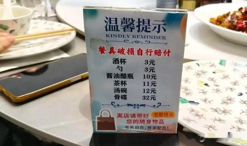 你支持谁?一网友吐槽店家没格局,桌上摆着牌子提醒顾客打碎餐具要赔偿多少钱,这餐具也不是新的呀,都用了几年了,难道不折旧的吗? 一位网友去饭店吃饭,瞧见桌上摆着个醒目的提醒牌,上面白纸黑字写着顾客打碎餐具要赔偿的具体金额。 这位网友心里顿时就犯起了嘀咕,觉得店家这做法实在有些不妥。他仔细端详那些餐具,发现都不是崭新的,明显已经用了好些年头,表面都有了岁月留下的痕迹。 他忍不住吐槽:这餐具都旧成这样了,难道就不考虑折旧的问题吗?还让人按原价赔偿,这不是太斤斤计较、太没格局了吗? 这位网友的吐槽,瞬间在网络上引发了激烈的讨论。有的人觉得店家太小气,明明餐具已经用旧了,还要按原价赔偿,简直是在“趁火打劫”。有人更是直言:“这不是不讲人情,是不懂经营!你用旧餐具,难道还要按照新的一样赔偿?这不是坑人嘛!” 但也有人站出来为店家辩护:他们说,餐具的赔偿金额其实是有法律依据的,毕竟这是合同的一部分,既然签了协议,就要遵守。而且,店家设置提醒牌,也是为了避免不必要的损失,保护经营者的权益。毕竟,餐具的折旧不是一两天就能算清楚的,按原价赔偿,或许是出于对公平的考虑。 这场争论,折射出一个更深层次的问题:在现代商业社会中,谁该为“损耗”买单?是商家在保护自己的资产,还是顾客在享受服务的同时,也要承担相应的责任?这个问题,看似简单,却牵扯出我们对“公平”“责任”以及“格局”的认知差异。 其实,事情的核心不在于餐具的价值,而在于“尊重”和“信任”。商家设置提醒牌,或许是出于对自我权益的保护,但如果方式太过“死板”,就会让人觉得“被算计”。而顾客的抱怨,也反映出对“人情味”的期待——毕竟,谁都希望在消费过程中,能感受到一份温暖和理解。 这个故事,提醒我们每个人:在商业和生活中,格局不只是金钱的多少,更是对彼此的尊重和宽容。商家要懂得在保护自己权益的同时,也要考虑到顾客的感受;而消费者,也应明白,规则虽要遵守,但人情味才是维系关系的润滑剂。 最后,或许我们都该换个角度看问题:不是单纯的“赔偿金额”,而是那份“信任与尊重”的价值。只有在彼此理解和包容中,才能共建一个更温暖、更有格局的社会。你怎么看?欢迎留言分享你的看法,让我们一起探讨这个“格局”与“责任”的话题!头号周刊 餐馆赔偿