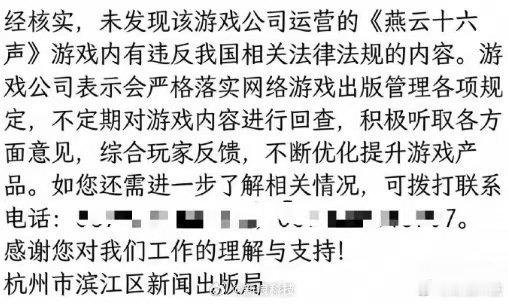 【相关部门回应燕云十六声争议:《燕云十六声》相关时装没有违法内容】近日,游戏《燕云十六声》上线新时装引发网友争议。有投诉人陆续在社交平台晒出政府的回复,表示未发现《燕云十六声》游戏内有违反我国相关法律法规内容。此前,《燕云十六声》已公开回复,“飞白成诗”系列时装上线后实机演示出现异常,部分故障,游戏当日已安排紧急修复,随后再次发布优化方案。游戏官方公告显示,外观“飞白成诗”的染色问题已于25日凌晨进行了首批修复,现女款外观已恢复染色功能,男款仍在紧急修复中……并将尽快完成男款修复并开放染色。此外,还会在后续更新中为男女时装增加了不同裁造方案。在随后游戏官方客服给玩家的回应也显示,25日“修复了‘飞白成诗’女款上身与裙摆部分区域染色效果异常的情况;修复了‘飞白成诗’女款背后模型细节显示错误的情况。