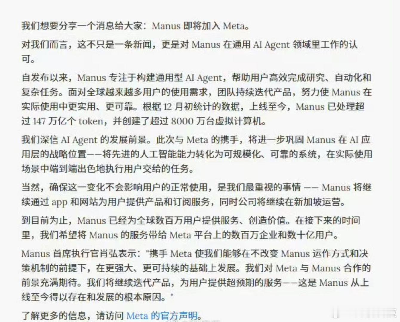 【Meta收购Manus】12月30日,Meta 公司已同意收购开发 AI 智能体 Manus 的公司蝴蝶效应,该公司总部位于新加坡,主营面向中小企业的人工智能智能体产品。这笔收购是 Meta 围绕其巨额人工智能投资布局商业版图的重要举措之一。目前,人工智能业务已成为公司首席执行官马克・扎克伯格的核心关注点,同时跃升为企业的首要战略任务。Manus 今年年初的年化营收达 1.25 亿美元(现汇率约合 8.77 亿元人民币),其智能体产品采用订阅制模式销售,这一模式有望让 Meta 的部分人工智能投资更快产生回报。本次交易的具体财务条款未对外披露。另据晚点 LatePost 报道,此次收购的交易金额为数十亿美元,这是 Meta 成立以来第三大收购,花费仅次于 WhatsApp 和 Scale AI。收购完成后,蝴蝶效应公司将保持独立运作,创始人肖弘出任 Meta 副总裁。值得一提的是,蝴蝶效应最初成立于中国,后迁至新加坡。今年早些时候,该母公司完成一轮融资,估值接近 5 亿美元(现汇率约合 35.07 亿元人民币),投资方包括知名风投机构基准资本(Benchmark)在内的多家投资主体。今年年初,Manus 推出了一款人工智能智能体产品,可以完成一些一般性任务,包括筛选简历、制定旅行行程以及根据基本指令分析股票。(IT之家)