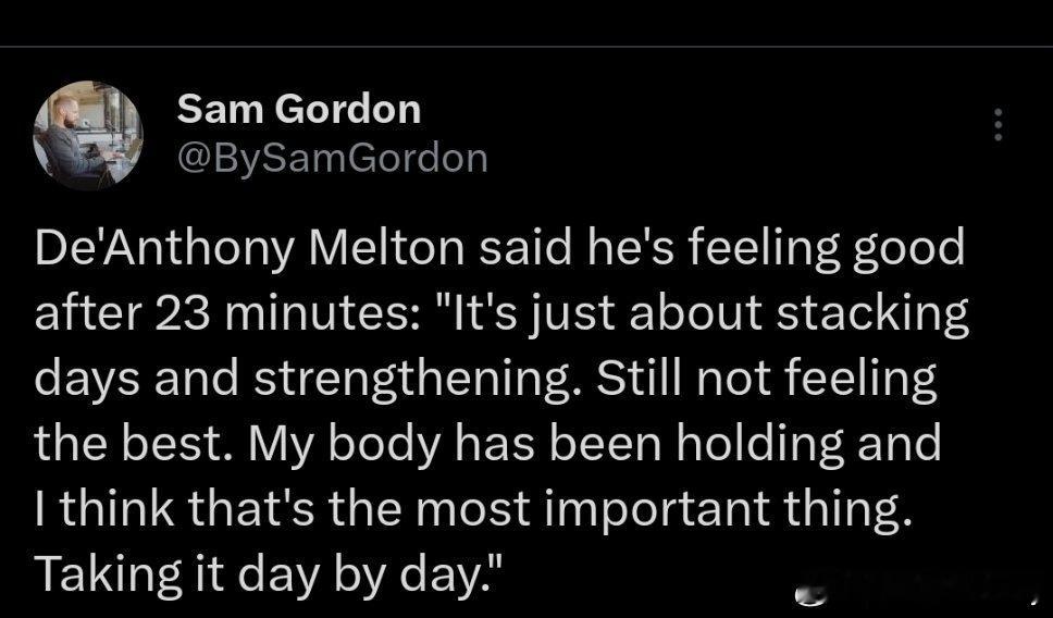梅尔顿表示,打了23分钟后自己感觉不错,关键是一天天累积训练量、增强身体状态。现在还没到最佳感觉,但身体顶住了,这才是最重要的。一步一步来,按天推进。