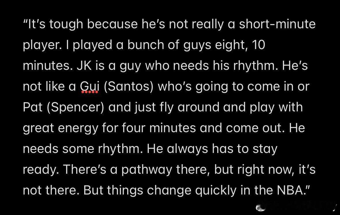 科尔谈到库明加是否重返轮换:“这很难,因为他并不是那种只打很短时间就能发挥的球员。我让不少人只打了8-10分钟。库明加这种球员需要比赛节奏,他不像桑托斯那样,或者斯宾塞可以一上来就满场飞奔,用极高的能量打四分钟再下来。他需要找到节奏。他必须时刻做好准备。确实有一条发展路径,但就目前而言,这条路还没有出现。不过在 NBA,情况变化得非常快。”