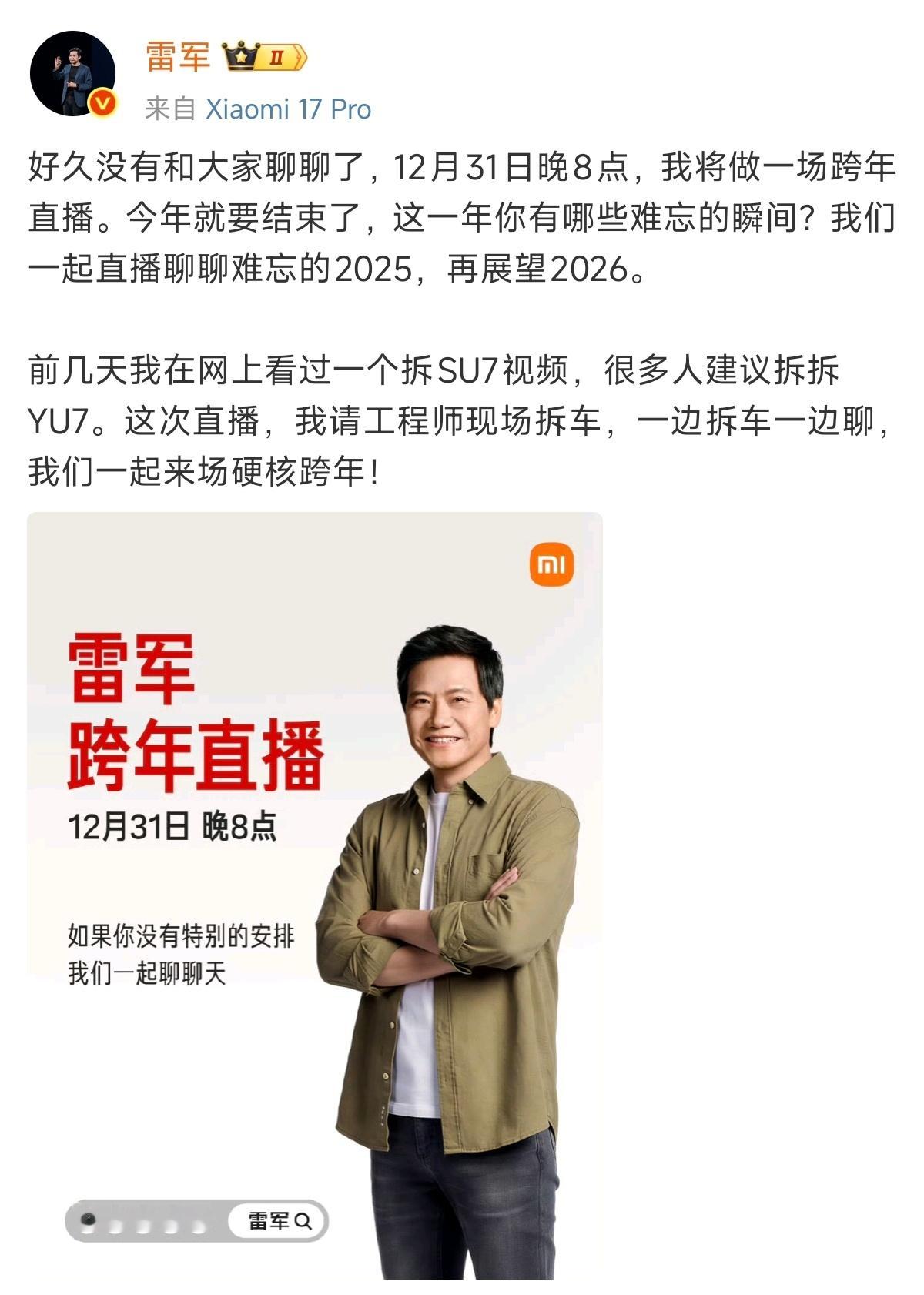 雷军跨年直播拆车许久未见雷总直播,这次跨年终于来了,而且上来就是直播拆一辆YU7。其实不论是SU7还是YU7都被拆过,网络上有视频有讲解。两款车不论是从车的用料还是工艺水平都是当下的顶尖水平。不过直播拆车的意义还是不同的,这次应该会是小米汽车工程师一起拆车,边拆边讲解。能在跨年的时间段看这样一场拆车直播,几乎就是一次免费的汽车公开课。这次直播估计会挺有乐趣,不知道网络上的这些“专家们”,能不能在评论区发表出来“真知灼见”,还是说连直播都不会看只会在背后叨叨呢,让我们一起拭目以待。