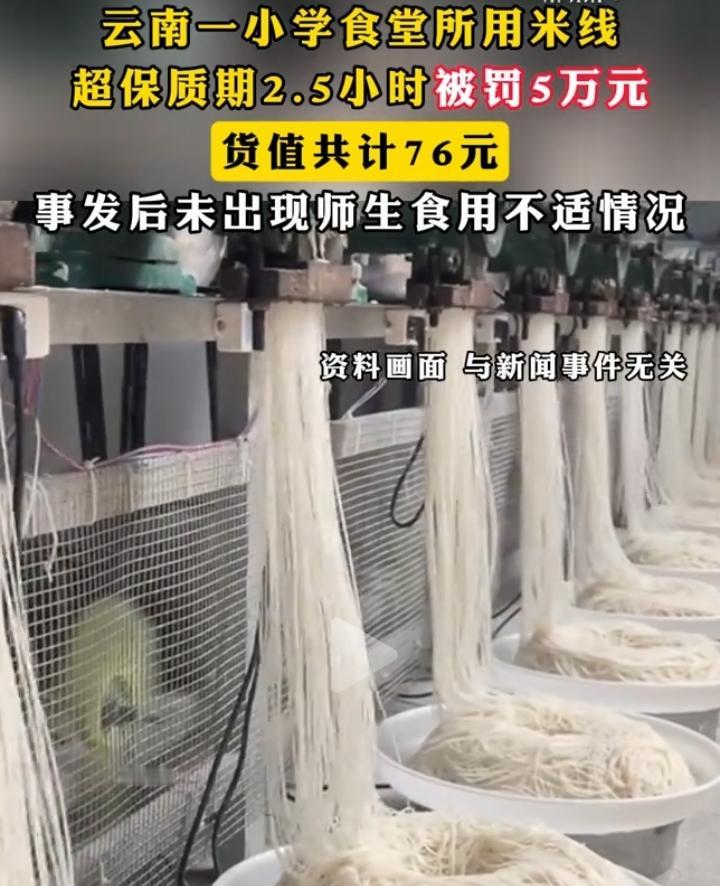 米线过期2.5小时,学校被罚5万。 事关孩子,一分钟都不能差。 这次给云南昆明东川区市监局点赞。 该小学前一天买的米线,保质期只有24小时,结果第二天做给学生吃,吃的时候已经过期2.5小时。 米线价值仅仅几十块,不过罚款却高达5万元。有网友认为才过期2.5小时这不算什么,但是我们要知道,不论是2.5小时还是25天,都是过期,罚款的目的是为了孩子们的健康,在这方面一分一毫都不能出问题。