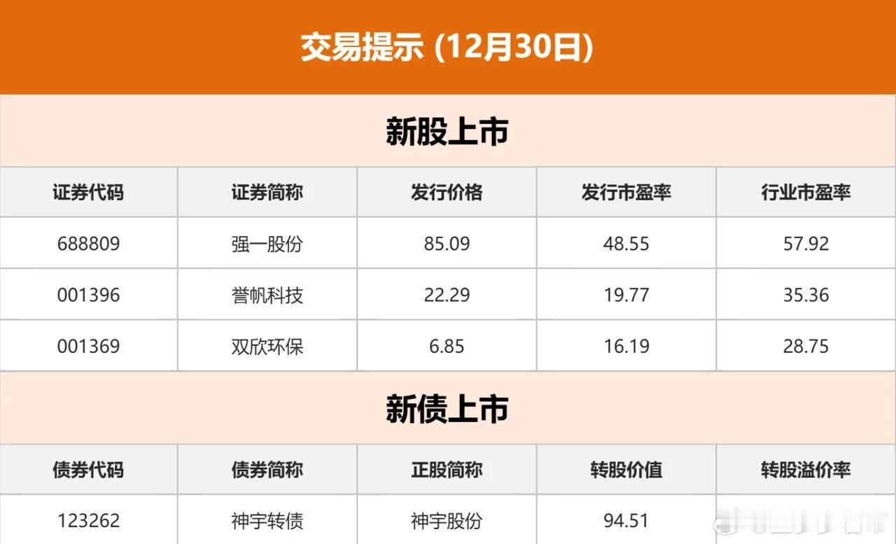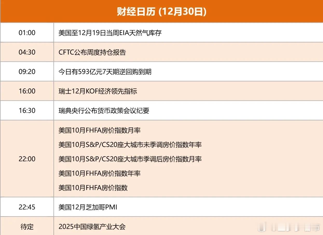 12.30股市早知道:1、外盘汇总:小跌,如图一。 2、交易提示:如图二。 3、财经日历:如图三。 4、三大指数:1)大盘:继续看涨2)创指:新目标34703)科创50:继续看涨 5、重要新闻:1)国家能源局:加快构建高质量充电基础设施体系;2)市监总局部署明年重点任务,提出加强反垄断反不正当竞争执法,深入整治“内卷式”竞争;3)发改委等六部门联合印发《现代物流标准化重点工作计划(2025—2027年)》。 6、市场动态:1)中国诚通、联通等新设科创投资基金,出资额100亿元;2)上海市商务委员会等16部门印发《关于进一步扩大上海服务消费的若干措施》。 7、公司公告:1)杭州热电:拟签订三年期煤炭购销合同;2)紫光国微:拟购买瑞能半导控股权或全部股权,股票停牌;3)赣锋锂业:因涉嫌内幕交易罪单位犯罪,案件已移送检察机关审查起诉;4)五矿发展:拟购买五矿矿业股权、鲁中矿业股权,股票停牌;5)国元证券:拟转让所持安元基金24.33%股权至关联方国元资本和国元投资;6)步长制药:控股子公司涉及诉讼事项,5.5亿元左右存货存在计提存货跌价准备的风险;7)国联民生:持有民生证券股权比例上升至99.98%。(关注点赞+评论,陪你一起到牛市)财经今日A股优质财经分享