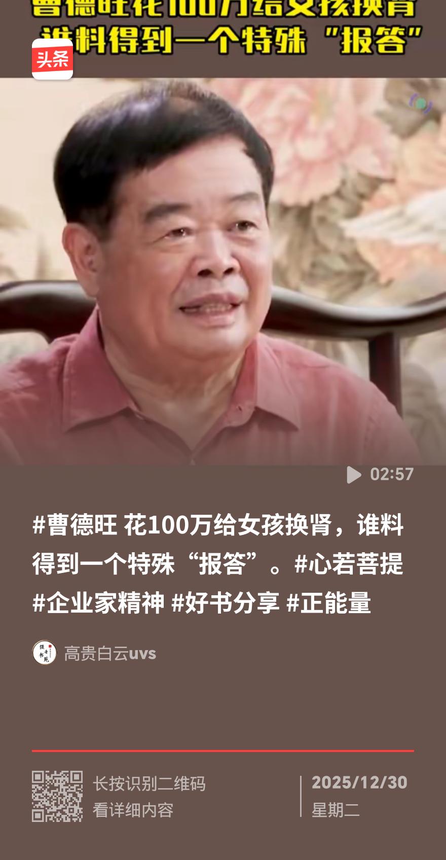 曹德旺100万换肾救女孩,八年后收获最暖“利息” 2015年,曹德旺的一个善举,不仅救下一条人命,更开启了一场跨越山海的爱心接力。 福建宁德深山里,17岁女孩小玲患上尿毒症,家里为治病掏空积蓄、借遍亲友,换肾成了唯一生路却苦于没钱。走投无路的父亲写下求助信寄给曹德旺,即便被秘书提醒可能是骗局,曹德旺仍拍板:“100万对我不算啥,救人要紧!” 他当即联系上海瑞金医院,安排顶尖团队为小玲手术,承担所有费用。术后康复的小玲,每年春节都会给曹德旺寄去笋干、蜂蜜等山货,用一封封书信汇报自己的成长。2018年,小玲考上福建医科大学却愁学费,曹德旺又二话不说打去5万元。 如今的小玲已成一名医生,接诊尿毒症患儿时,她主动联系福耀公益基金会,将当年收到的善意传递下去,救助更多困境中的患者。 曹德旺直言,这才是慈善最值钱的“利息”——不是简单捐钱,而是让爱心像接力棒一样,一棒接一棒传下去。曹德旺 曹德旺传奇故事 曹德旺人生智慧 三亿换肾