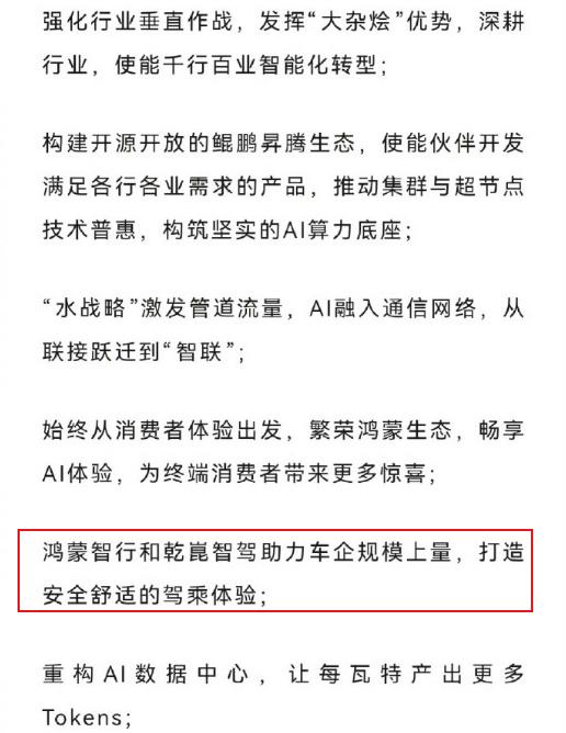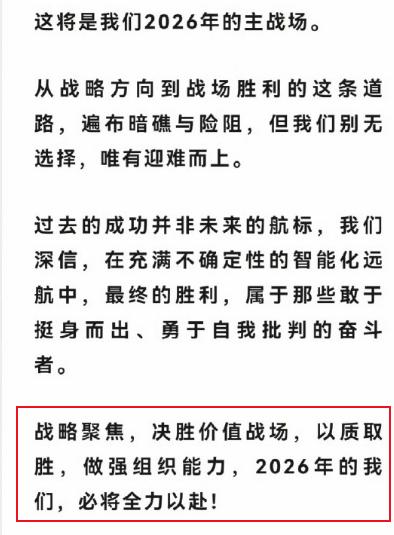 华为轮值董事长孟晚舟发布2026年新年致辞,我们可以从孟晚舟的致辞中看到华为的战略方向及应对策略,根据致辞内容,可以清晰地看到华为将在2026年战略聚焦,华为聚焦的战略方向就是抓住智能化转型的机遇。 在策略上,华为将“决胜价值战场,以质取胜”,这个策略是值得所有企业学习的,换一句话说,那就是不搞内卷,不搞低价策略,要以客户需求导向为客户创造价值,在品质上竞争。 其实在过去两三年,大家可以在鸿蒙智行和乾崑智驾方面看到华为的这种“价值策略”,例如华为与江淮汽车合作的尊界汽车,华为利用自己的技术赋能,让江淮这样一家过去只做普通汽车的企业打造出百万级的豪车品牌。