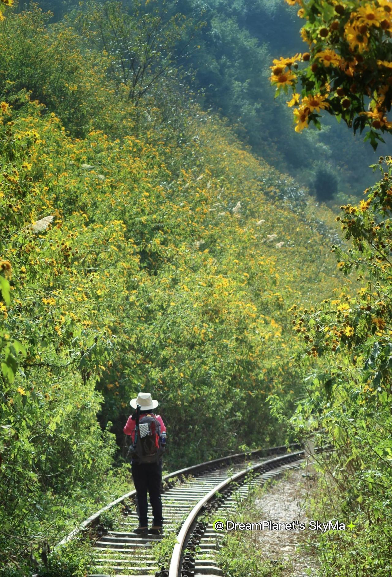 『玉溪周末徒步』滇越铁路|金色隧道 🌼滇越铁路“黄金15km”🌻 滴水→徐家渡,把1906年的法国工程师+2025年的末尾一起收进相机! 📜 历史彩蛋 1️⃣ 1904年法国殖民当局动工,1910年通车,是当时世界海拔落差最大(1954m)的窄轨铁路,被称作“百年米轨”。 2️⃣ 滴水站原名“砥水站”,法文站牌写着“Station de Tich-Choui”,百年来0改动。 3️⃣ 滇段全线桥隧比36%,平均1km一座桥、3km一条隧道——滴水-徐家渡短短15km就占了7隧5桥,是全线最密集区段之一。 4️⃣ 南盘江峡谷这一段,当年用“人字铁轨+马帮背料”硬把钢梁架到半山腰,法国《费加罗报》1911年头版称“铁路在云端跳舞”。 🌻 关于“肿柄菊” ▪️ 也叫“墨西哥向日葵”,9-12 月盛放,滇越铁路因货车停运+山谷微气候,成了它最爱的“流浪花园”。 ▪️ 外来物种但拍照真香,黄到发光,和锈迹铁轨撞色 100 分! ▪️ 花粉多,易过敏姐妹记得戴口罩~ 📅 花期倒计时 2025年12月底进入尾声,想去就这两天!再晚花杆倒伏,只剩“黄金地毯”效果,不如现在“花海隧道”震撼。 ⚠️ 安全&环保 ▪️废铁路≠无火车!偶尔有工务轨道车,听见金属撞击声立刻贴墙,别站轨道中央。 ▪️肿柄菊是外来入侵种,拍照请“三不”——不摘、不踩、不带走种子,让花海明年继续。 ▪️隧道内蝙蝠 harmless,别尖叫,用手电照顶它们就飞走。 ▪️垃圾随身带走,站台没垃圾桶。 周末去哪儿 徒步圈 徒步丈量世界 户外徒步 昆明徒步 穿越时光隧道 大自然徒步 逐梦星球 滇缅铁路徒步