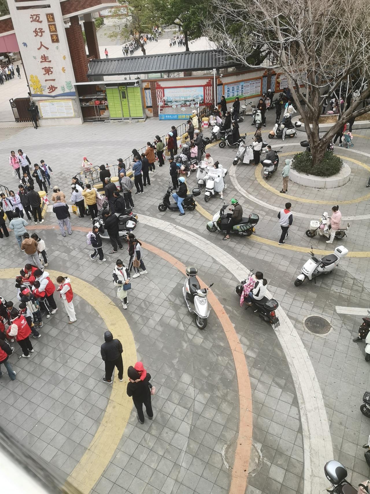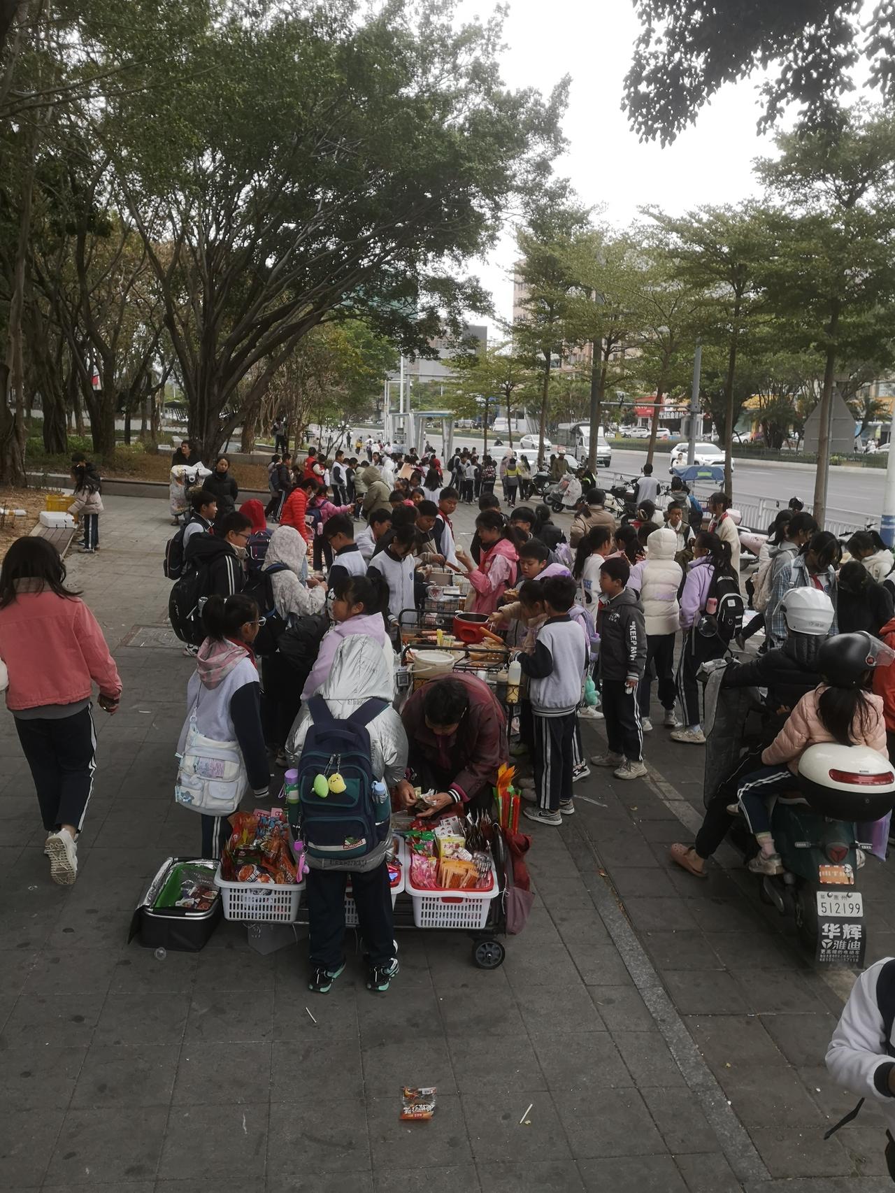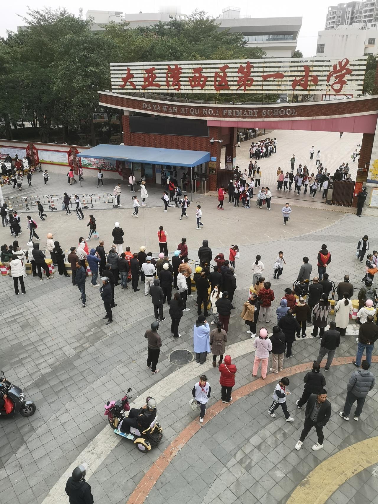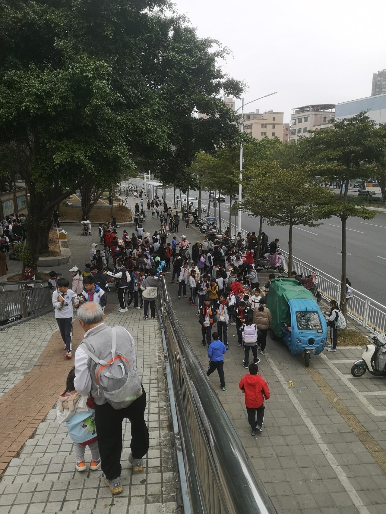 大亚湾西区第一小学中午放学时间,学校门口围满了接孩子的家长和学生。 现在的学校,小学生中午都是要回家吃饭休息的。记得以前的孩子都是在学校吃饭午休,只需要早晚接送。现在的孩子上学一天家长得往返学校8次,这还是一个孩子的情况下,如果两个孩子,又分在不同的学校,那做家长的可就够呛了。一天就来回接送孩子了,其他的啥也不用干了,所以现在养小孩家里有个老人帮忙照看,那真的是太重要了。 看着天桥旁边部分孩子没有家长及时来接回,冬天的天气这几天还是有点冷,孩子们都围着路边摆摊卖零食的摊位选购零食,还有部分是跟着午托机构的老师,有家长接送的孩子就可以回到家里吃饭休息。