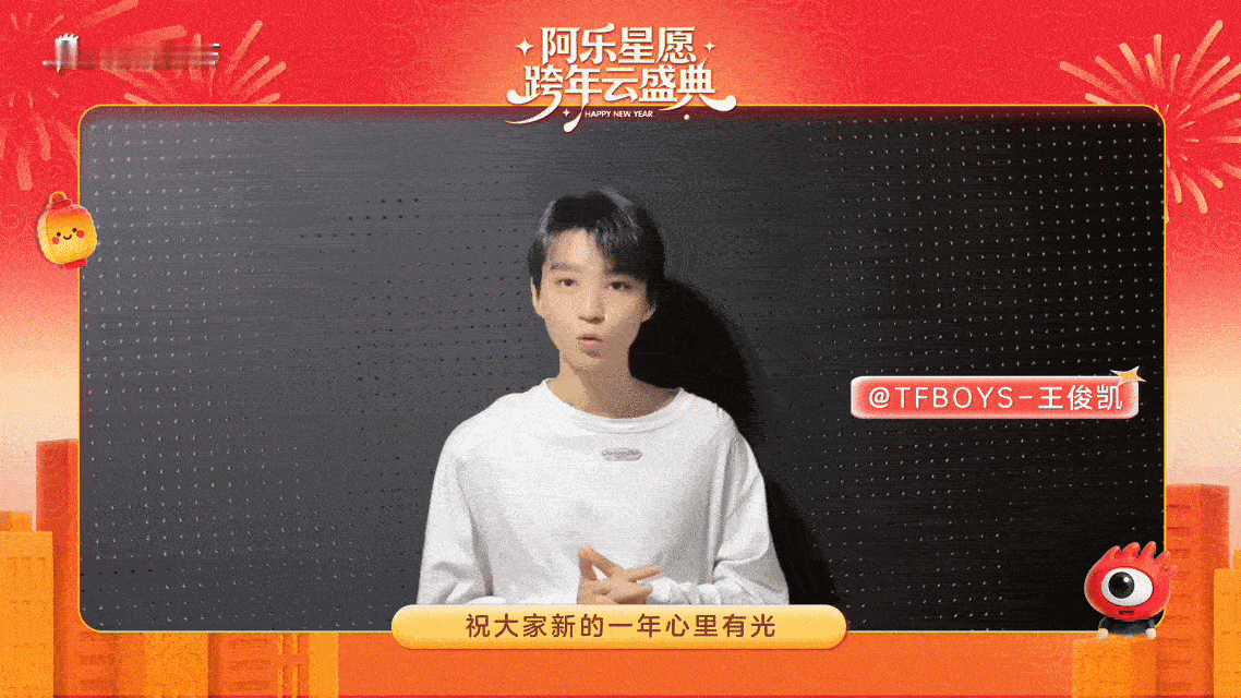 来自王俊凯的2026新年祝福王俊凯祝大家心里有光奔赴热爱 在 【阿乐星愿跨年云盛典】的祝福:“祝大家新的一年心里有光,奔赴热爱。”我们小凯到现在还是相信光的美男子一枚哈哈哈!