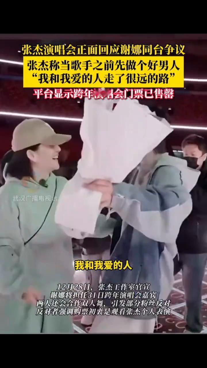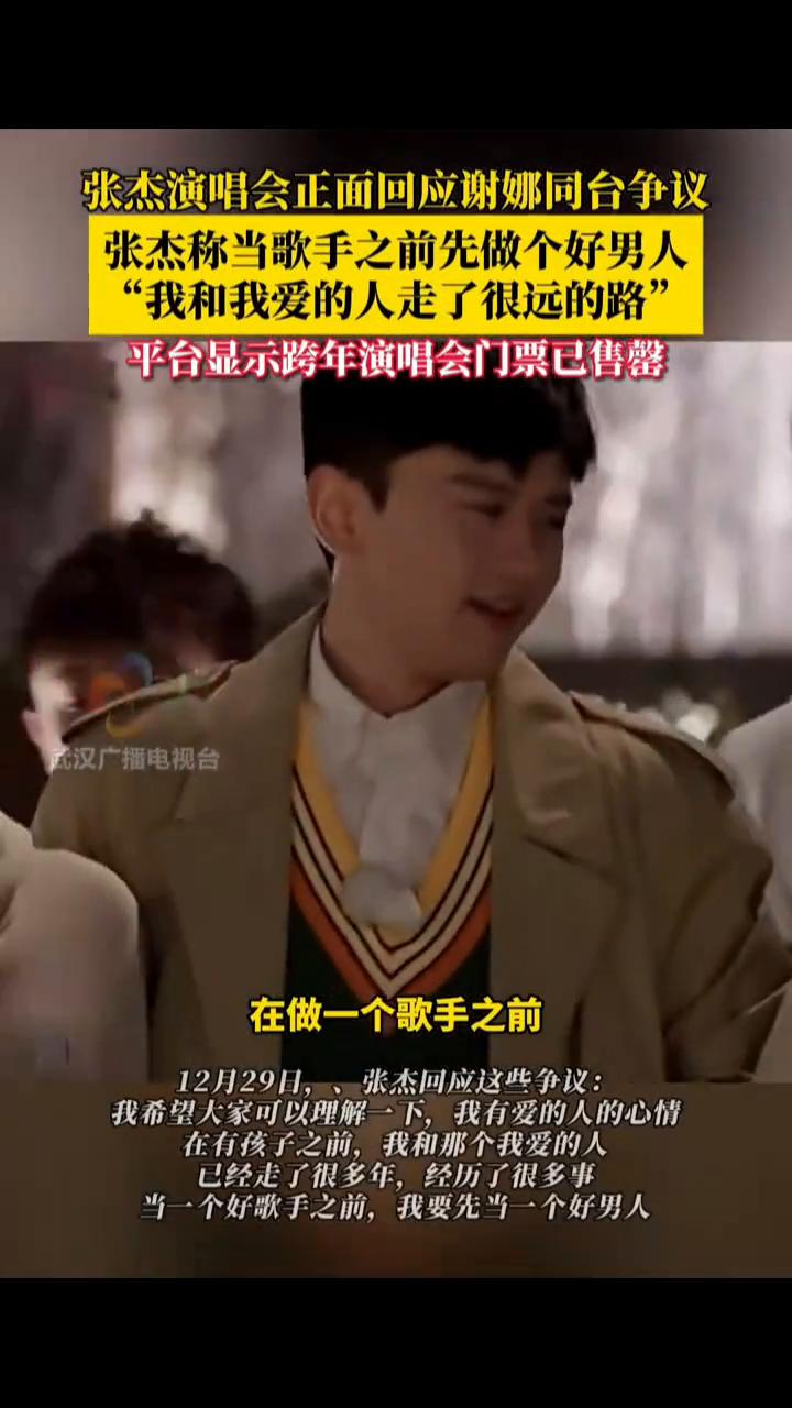 张杰演唱会正面回应谢娜同台争议,张杰称当歌手之前先做个好男人。 武汉广播电视台。 平台显示跨年演唱会门票已售罄,谢娜将担任31日跨年演唱会嘉宾,两人还会合作双人舞,引发部分粉丝反对。反对者强调购票初衷是观看张杰个人表演。 12月28日,张杰工作室官宣谢娜将担任31日跨年演唱会嘉宾,两人还会合作双人舞,引发部分粉丝反对。反对者强调购票初衷是观看张杰个人表演。 12月29日,张杰回应这些争议:我希望大家可以理解一下,我有爱的人的心情。在有孩子之前,我和那个我爱的人已经走了很多年,经历了很多事。当一个好歌手之前,我要先当一个好男人,要做一个好的男人。