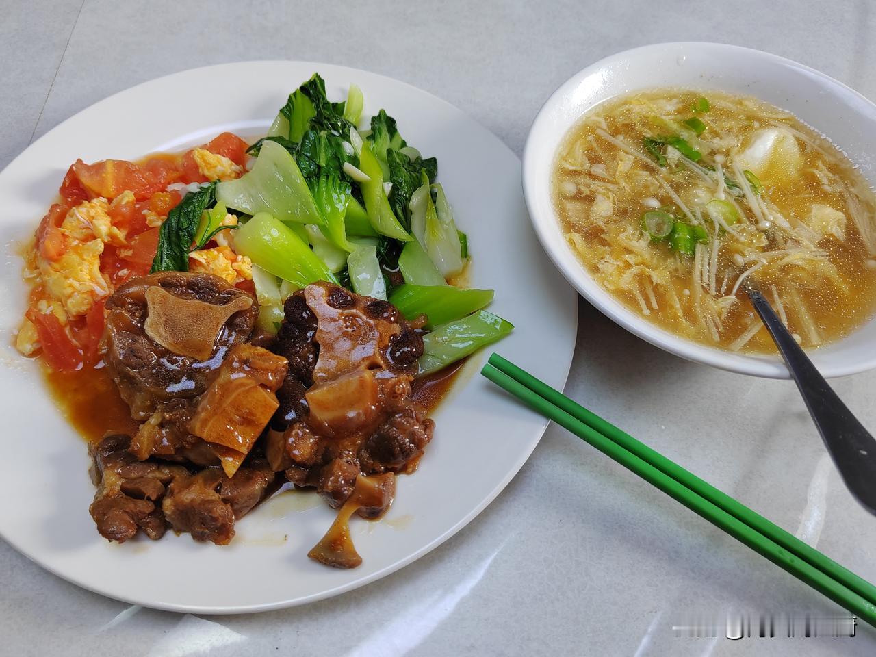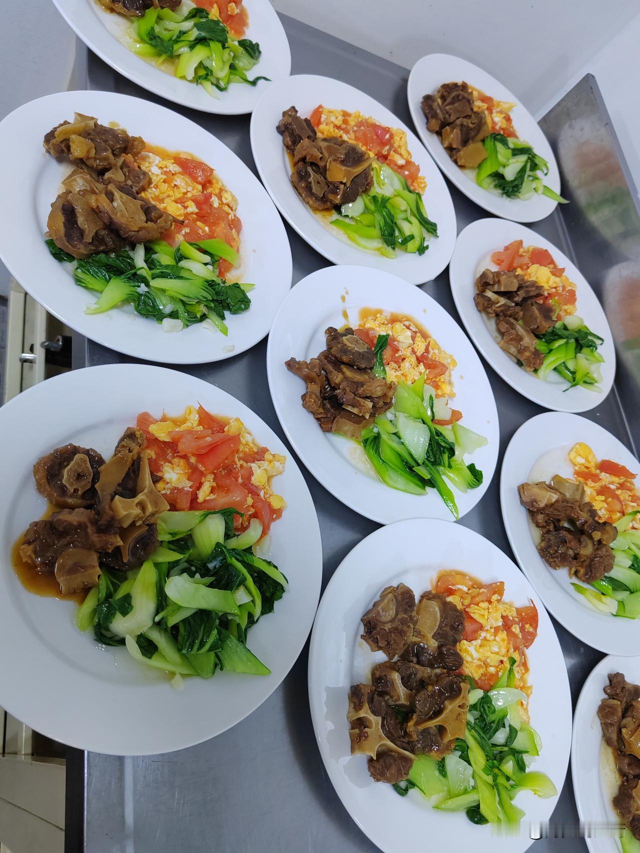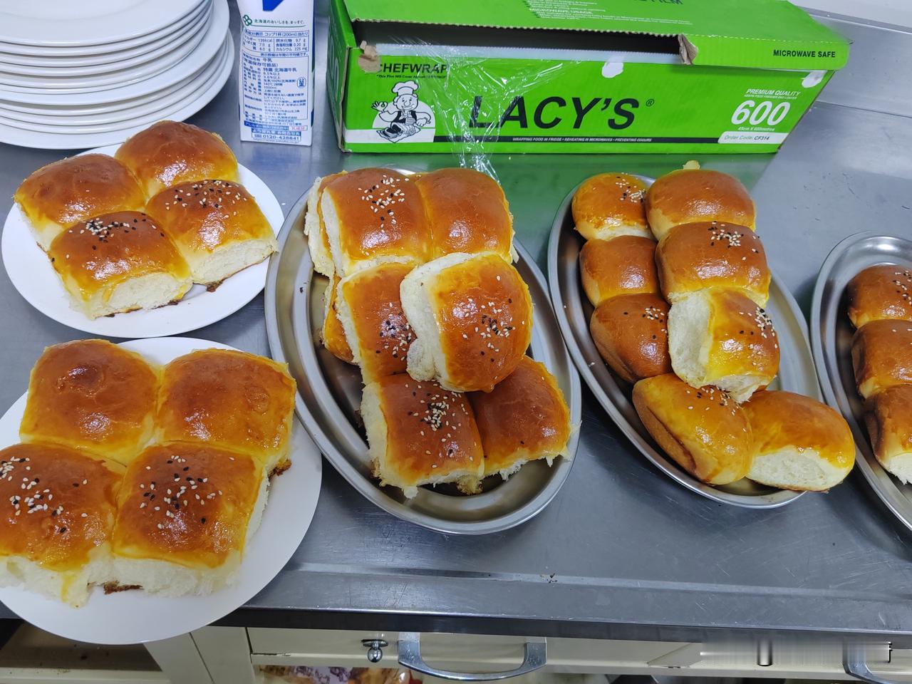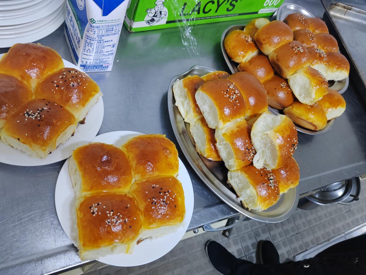 马上就到北海道了,天气是真冷啊,都开始下雪了。 在日本上伙食的时候,我申请了高筋粉和黄油,终于给我上来了,今天忙完了早餐,赶紧准备茶点——面包。今天的面包做的是真好,比买的还要蓬松宣软,颜色嘎嘎的正,甜度也是正好,以前做面包,总是感觉有点干,直到有一天看视频直播的时候,主播说烤箱上温定到多少度,下温定到多少度,湿度定到多少,我寻思着我们的烤箱没有这么高级,上下温是一个温度,也没有湿度。 于是在醒发的时候,我用不锈钢盆弄了一盆热水,放烤箱里醒发,湿度不就有了吗?醒发好了,烤制的时候,这盆热水一直放着,果不然,烤出来的面包是真软和。 今天的午餐做了红烧牛尾,西红柿鸡蛋,素炒上海青和金针菇豆腐蛋花汤!