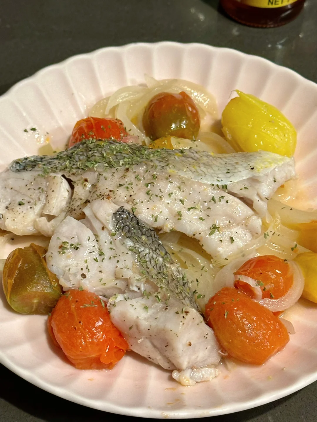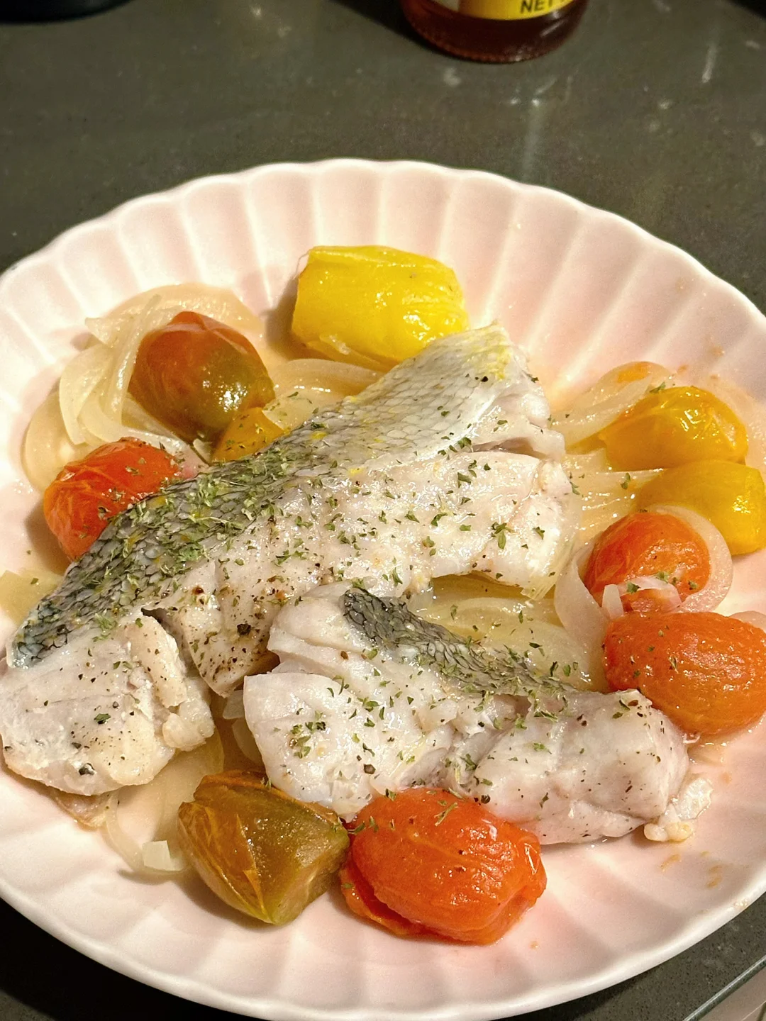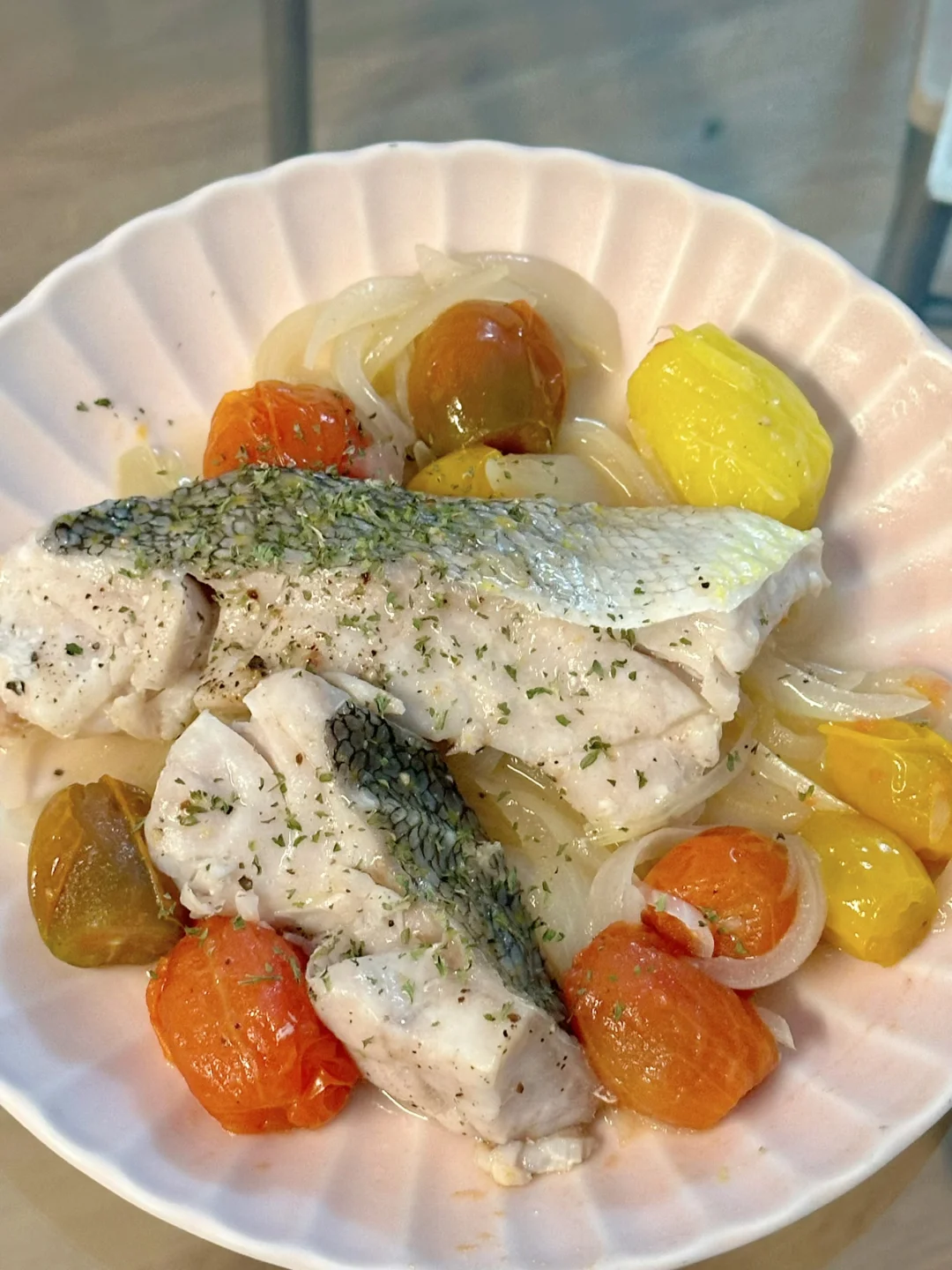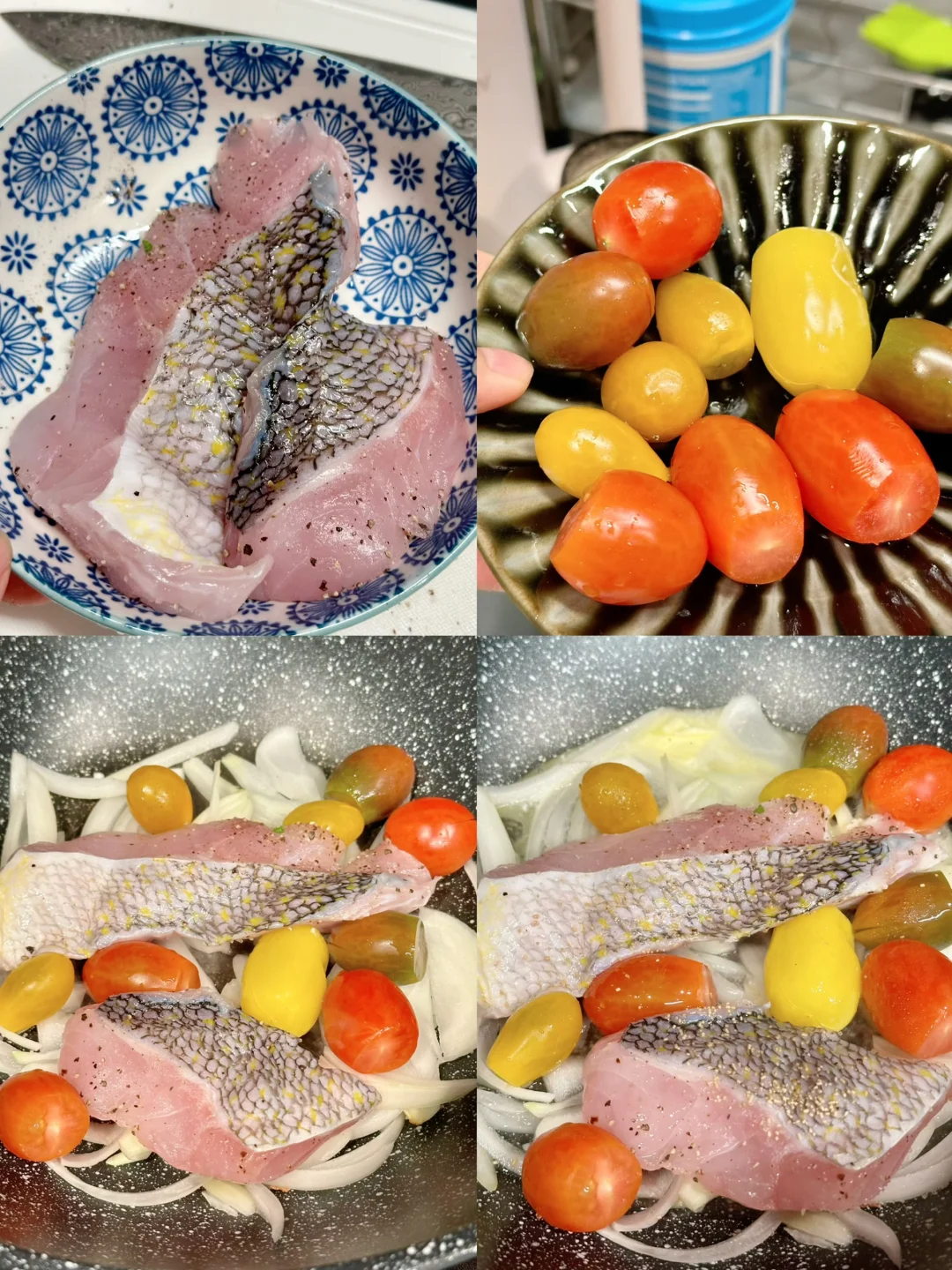 洋葱丝和小番茄铺底,放上鲷鱼片,淋清酒,放一小块黄油,中火蒸6-8分钟;