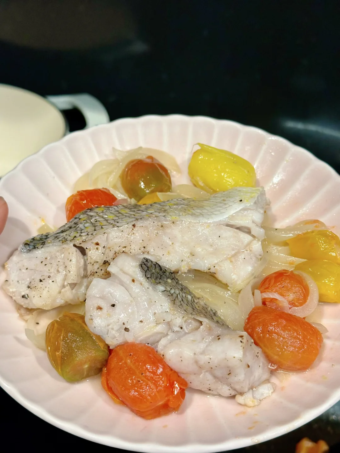 每次清淡调味烹饪白身鱼都会小小紧张,但这次的味道真的超级满意!不加一滴水,靠清酒和蔬菜的水分把鱼肉“蒸”熟,口感特别细腻嫩滑,而且揭开锅盖浓郁的酒香黄油香。最妙的是垫在底下的洋葱丝和小番茄,甜甜软软很入味好吃。