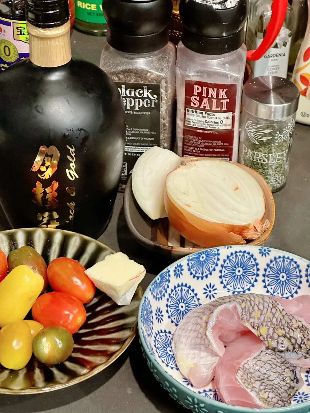 鲷鱼两片,盐和胡椒,小番茄一把,洋葱半个,清酒40ml,黄油10g,欧芹碎。