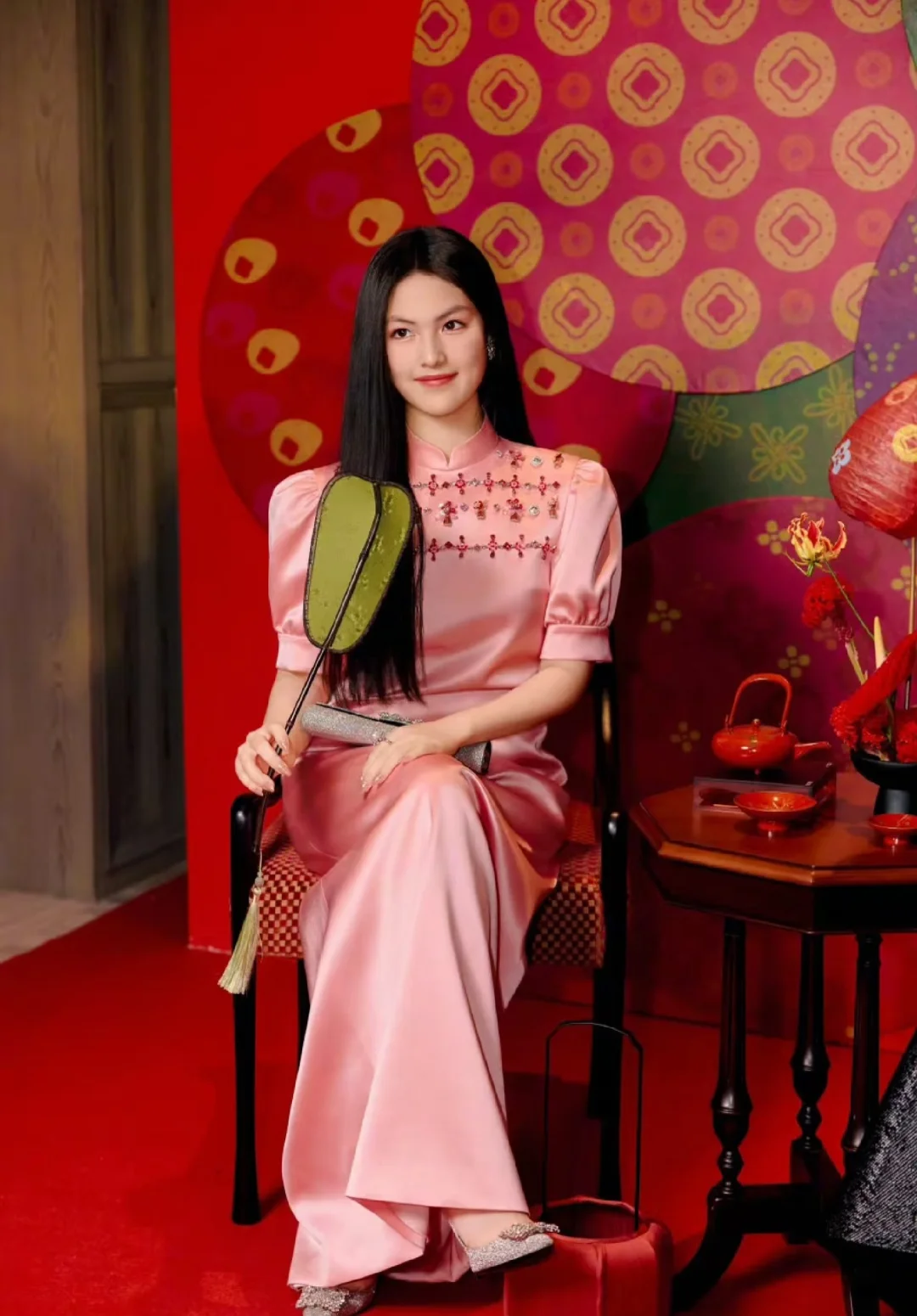 一袭粉缎抹胸长裙裹着柔光,吴宣仪的肩颈线条与锁骨曲线美得恰到好处,是行走的春日甜