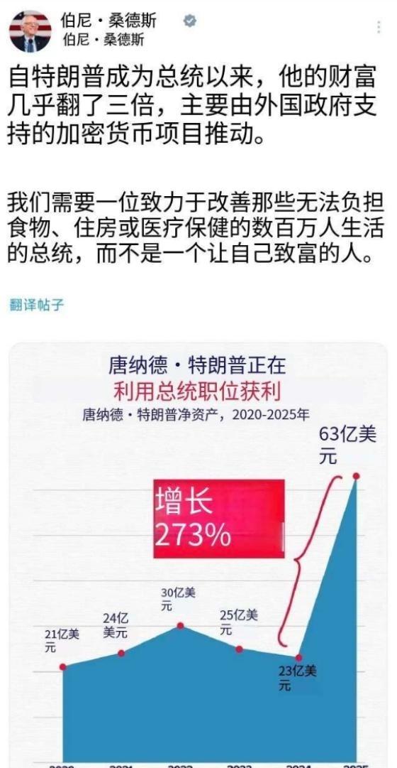 特朗普终于遭到了他们国民的谴责!12月28日,美国民主党籍参议员伯尼·桑德斯发文:“特朗普担任总统以来,他的财富几乎增长了三倍。我们需要一位致力于改善那些无法获得食物、住房或医疗保障的数百万民众生活的总统,而不是一位只想着让自己富裕起来的总统。” 桑德斯帖子发布于2025年12月27日,引用数据称特朗普财富自担任总统以来增长近三倍,达到约63亿美元,主要驱动因素是加密货币相关项目。这些项目吸引大量资金,其中不少来自海外投资者。World Liberty Financial平台是关键一环,家族实体从中获得大部分收益。2025年上半年,相关代币销售带来超过8亿美元收入。特朗普媒体公司股票也在市场波动中上涨,尽管公司本身有亏损。桑德斯强调,这种增长发生在数百万美国人面临食物、住房和医疗压力之际。 美国许多家庭收入勉强覆盖开支,房租和医疗费用占比高,一旦失业或生病,就容易陷入困境。税收体系对高资产者有各种减免,而普通工薪阶层承担更多比例。信用记录一旦受损,后续生活难度增加。桑德斯帖子指出,国家需要领导者优先解决这些问题,而不是专注个人资产扩张。帖子中提到外国资金注入加密项目,占比达70%,引发对利益冲突的讨论。 特朗普财富从2020年左右的21亿美元左右,增长到2025年的更高水平,增幅约273%。加密市场在2025年波动大,11月一度下跌导致净值减少10亿美元以上,但随后反弹。家族推出的代币销售和平台运营,直接贡献数百亿美元纸面收益。房地产和高尔夫球场等传统资产也提供稳定收入。桑德斯对比这种增长与民众现实,突出贫富差距扩大。 帖子发布后,网络转发量快速上升,数小时内超过数十万。一些民主党议员转发,支持对财富集中的批评。媒体报道跟进,引用福布斯和彭博数据分析来源。公众留言分享经历,如医疗费用导致债务,或失业后租房困难。事件成为政治话题的一部分,讨论权力与财富交织。 特朗普方面未直接回应此帖,继续推进政策。白宫发言人处理其他议题。家族加密项目持续运营,市场波动影响估值,但整体净值维持高位。桑德斯继续在参议院活动,反对贫富差距。2025年底,相关讨论仍出现在媒体中,两人立场保持对立。 美国经济不平等问题由来已久,顶层财富快速积累,而底层群体生活压力不减。税收政策和监管松紧,直接影响资金流向。加密货币作为新兴领域,监管滞后,导致资金来源复杂。普通人面对房价上涨和医疗账单,储蓄率低,容易陷入循环。 桑德斯长期发声,强调需要系统性改变,如加强医疗覆盖和住房支持。特朗普业务扩展受益于市场和政策环境。事件反映出公众对公平的期待与现实差距。