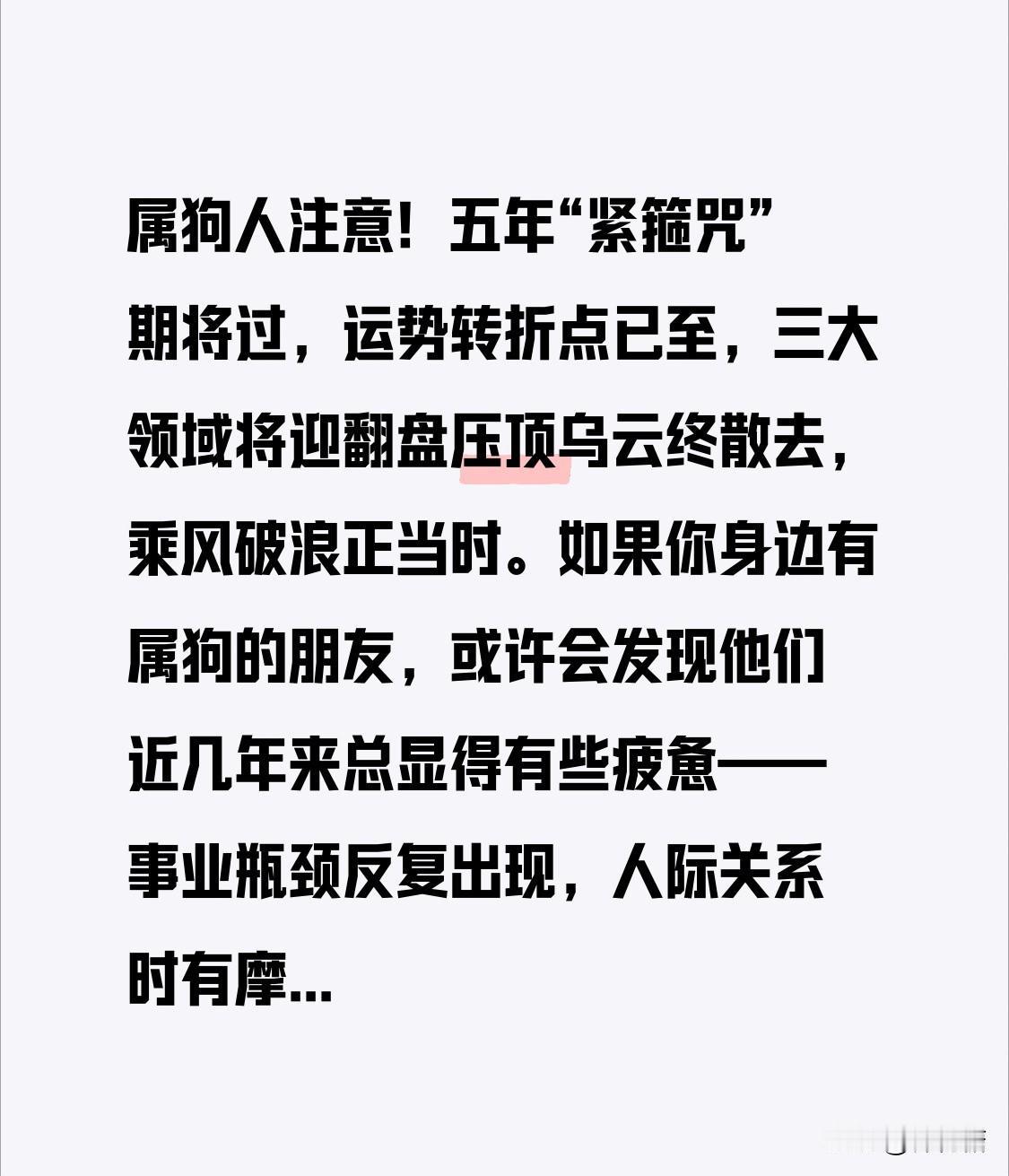 属狗人注意!五年“紧箍咒”期将过,运势转折点已至,三大领域将迎翻盘 压顶乌云终散去,乘风破浪正当时。 如果你身边有属狗的朋友,或许会发现他们近几年来总显得有些疲惫——事业瓶颈反复出现,人际关系时有摩擦,连健康状况也小问题不断。这并非偶然,在传统星象解读中,这往往与土星运行带来的长期考验有关。 一、五年“土星期”:磨砺与沉淀 过去五年,象征压力与挑战的土星持续影响着属狗人的运势轨迹。不少属狗朋友反馈: · 事业上:努力常遇阻碍,晋升缓慢,项目推进总差“最后一口气” · 人际中:误解增多,贵人运平淡,需独自承担较多压力 · 健康面:容易感到精力不济,小毛病反复,身体预警频发 这段时期看似艰难,实则暗藏深意。土星虽严苛,却也如同一位严师,逼我们夯实基础、审视方向、剔除浮华。许多属狗人在这五年里,反而养成了更稳重的处事风格,积累了扎实的应变能力。 二、转折已启:三方面运势明显回升 随着土星的影响逐渐消退,转机已在眼前。未来半年,属狗人将迎来以下积极变化: 1. 事业障碍扫除,机会窗口打开 原有项目中纠缠不清的难题会出现转机,之前被搁置的计划可能重新启动。更重要的是,新的机遇正在酝酿——可能是跨领域合作、岗位调整或贵人引荐。建议属狗人主动梳理自身优势,准备好迎接事业上的“破局时刻”。 2. 人际关系回暖,助力明显增强 人际方面的紧张感将逐步缓解,与同事、合作伙伴的沟通会变得更加顺畅。曾经因误会疏远的关系可能出现修复契机。主动表达善意、组织小型聚会,有助于加速人脉回暖,为下一步发展积累助力。 3. 身心状态回升,活力逐步回归 长期积累的疲劳感会得到缓解,睡眠质量提升,精力逐渐恢复。这是调整生活习惯的好时机,建议建立规律的运动计划,并重视年度体检,为接下来的冲刺储备充足的能量。 三、未来半年行动指南:主动把握,稳中求进 运势转换期既是机遇,也需智慧把握。属狗人可聚焦以下行动: ▶ 主动展现价值,抢占先机 在职场中,可主动承接关键任务,在会议中提出建设性意见。不要等待机会,而应创造机会,让上级和伙伴看到你经过沉淀后的成长与能力。 ▶ 梳理人际网络,重点维护 整理通讯录,主动联系半年内未沟通的重要人脉。关系维护贵在真诚,一句问候、一次小聚,都可能在未来为你打开新的局面。 ▶ 健康不可松懈,根基需稳 将健康管理列入每日计划,哪怕只是每日快步走、规律作息。记住:好身体是好运势的根基,尤其在上升期,充沛的精力是把握一切机会的前提。 --- 运势如潮水,有低自有高。 属狗人这五年的坚持与沉淀,已为接下来的上升期打下坚实基础。如今转机已现,关键在于调整心态,主动出击。 你或身边的属狗亲友是否正感受到这些变化?欢迎在评论区分享经历与观察——相互鼓励,一起迎接更好的阶段! 属狗人财运 属狗人发展 属狗偏财运 属狗人本月财运 属狗者 属狗人接运势 属狗人明天有喜