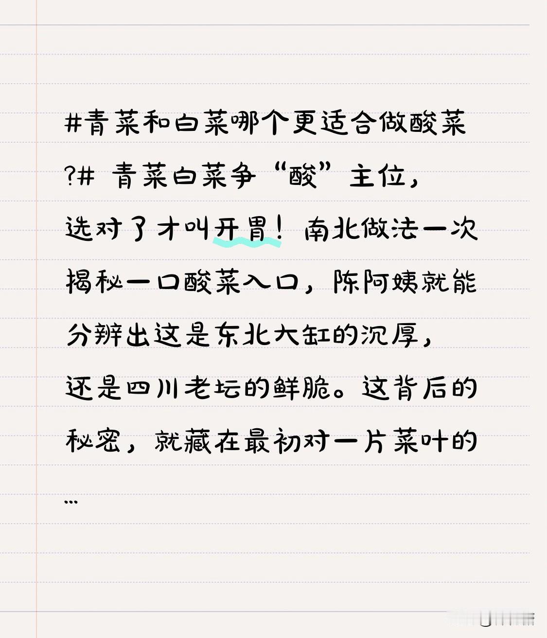 青菜和白菜哪个更适合做酸菜? 青菜白菜争“酸”主位,选对了才叫开胃!南北做法一次揭秘 一口酸菜入口,陈阿姨就能分辨出这是东北大缸的沉厚,还是四川老坛的鲜脆。这背后的秘密,就藏在最初对一片菜叶的选择里。 中国家庭的厨房里,酸菜是一种跨越地域的情感连接。但南北对“青菜”与“白菜”的理解分歧,却让许多人第一次自制酸菜时就踩了坑。 在北方语境里,酸菜的绝对主角是大白菜,尤其是那句“翠花,上酸菜”里的酸菜,指的便是它。而在南方,特别是四川、湖南等地,制作酸菜的“青菜”通常指的是芥菜。芥菜家族庞大,包括了雪里蕻、儿菜叶等多个品种。 这两种菜做出的酸菜,风味截然不同。 • 大白菜酸菜 以大白菜为原料。发酵后口感柔软、酸味醇厚温和,带有白菜本身的淡淡清甜。色泽呈乳白色或黄白色。适合长时间炖煮,与肉类搭配能很好地解腻增香。 • 芥菜酸菜 以芥菜为原料。口感爽脆、酸味鲜明直接,常带有辣椒、花椒等调料的复合风味。成品呈黄绿色。多作为调味配菜,为菜肴提供爽脆口感和酸香风味。 这两种风味差异,源于它们不同的发酵方式。北方酸菜制作周期长,南方则更灵活。 🔴 北方大缸慢发酵 东北酸菜的制作是一场与时间的对话。深秋时节,挑选瓷实的大白菜,晒1-2天去除部分水分。洗净后,在沸水中短暂烫过。接着一层白菜一层盐(通常每10斤白菜用1.5-2.5两盐)码入大缸,压上沉重的石头,注入凉白开淹没。随后将缸置于5-15℃的阴凉处,等待至少30天的自然发酵。全程忌油忌生水,依靠乳酸菌将白菜转化为酸香醇厚的滋味。 🔴 南方老坛多风味 四川酸菜的制作则更具巧思。核心是拥有一坛“老盐水”——用凉开水、大量盐、以及花椒、姜、蒜、辣椒等香料调制的母水。芥菜洗净后必须彻底晾干表面生水。将菜拧成束放入专用的泡菜坛,倒入完全凉透的盐水没过所有食材,在坛沿水槽注水密封,营造厌氧环境。在温暖环境下,一周左右即可取食,这便是“洗澡泡菜”;若追求更醇酸的风味,则可延长浸泡时间。 了解完做法,究竟该怎么选? 如果你追求酸香醇厚,喜食炖菜,例如想做酸菜白肉、酸菜炖粉条,大白菜是不二之选。它丰盈的汁水经长时间发酵和炖煮后,能形成浓郁酸鲜的汤汁。 如果你偏爱脆爽酸辣,擅长快炒,例如烹饪酸菜鱼、炒酸菜肉末,芥菜(南方青菜)则更为合适。它紧实的质地能保持脆感,鲜明的酸味能迅速激发食欲。 对新手而言,大白菜成功率更高,因其水分足,更容易被盐水浸没,不易腐坏。而制作南方酸菜,确保蔬菜完全晾干和无油无菌操作是关键。 无论选择哪种,安全是自制酸菜的底线。营养师提醒,腌菜中亚硝酸盐含量通常在腌制第3-4天达到高峰,随后下降。因此,建议腌制至少20天后再食用,此时含量已大幅降低。食用时,也最好将其作为调剂风味的配菜,并搭配新鲜蔬菜水果。 --- 厨房里,陈阿姨的两个坛子总并排放在阴凉处。一边是北方女婿想念的家乡炖酸菜,另一边是川籍儿媳离不了的酸菜鱼料。她说,所谓家常味,就是尊重每一片菜叶的本性,让它在时间与技艺中,舒展成家人最挂念的那口酸。酸菜腌制 酸菜家常做法 腌酸菜大白菜 腌白菜 酸菜腌制教程 酸菜白菜 腌酸菜配方