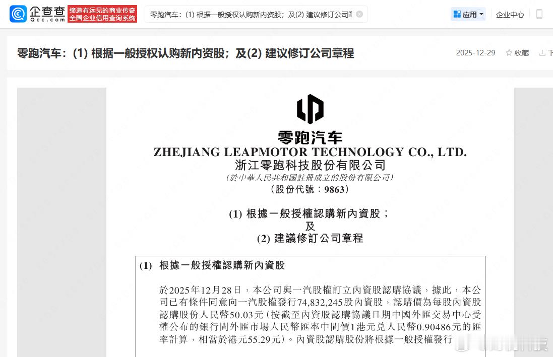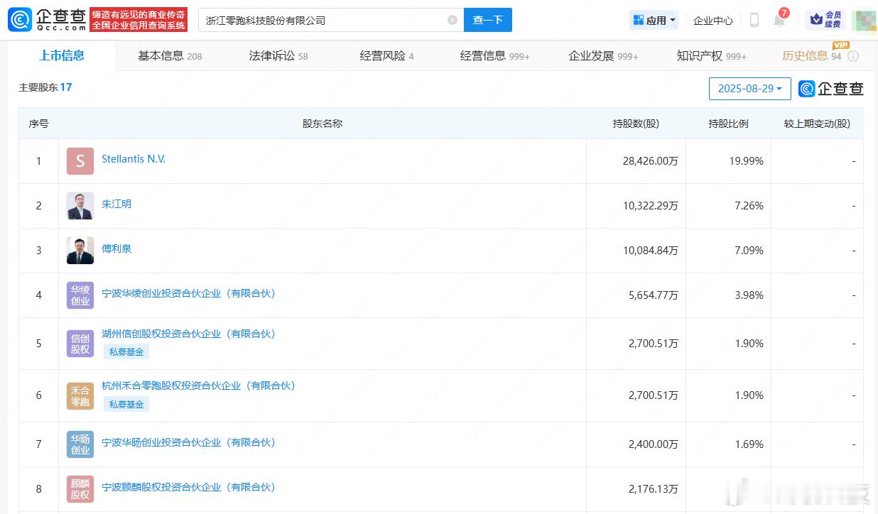 【零跑汽车股东持股比例,朱江明回应一汽股权认购零跑近7500万股】12月29日,零跑汽车在港交所公告,12月28日,公司与一汽股权订立内资股认购协议,据此,公司已有条件同意向一汽股权发行74,832,245股内资股,认购价为每股内资股认购股份人民币50.03元(相当于55.29元港元,零跑最新收盘价为49.84港元)。后续,零跑汽车创始人、董事长朱江明回应称,要保证实控人的控制权,这是不会改变的。有了大股东的加入和支持,以及战略层面和产品层面的合作,公司的稳定性会更强。企查查APP显示,在一汽股权溢价认购零跑近7500万股前,Stellantis N.V.持股零跑汽车约19.99%、朱江明持股约7.26%、傅利泉持股约7.09%。其他主要股东分别为宁波华绫创业投资合伙企业(有限合伙)、湖州信创股权投资合伙企业(有限合伙)、杭州禾合零跑股权投资合伙企业(有限合伙)等。各位网友,您怎么看?