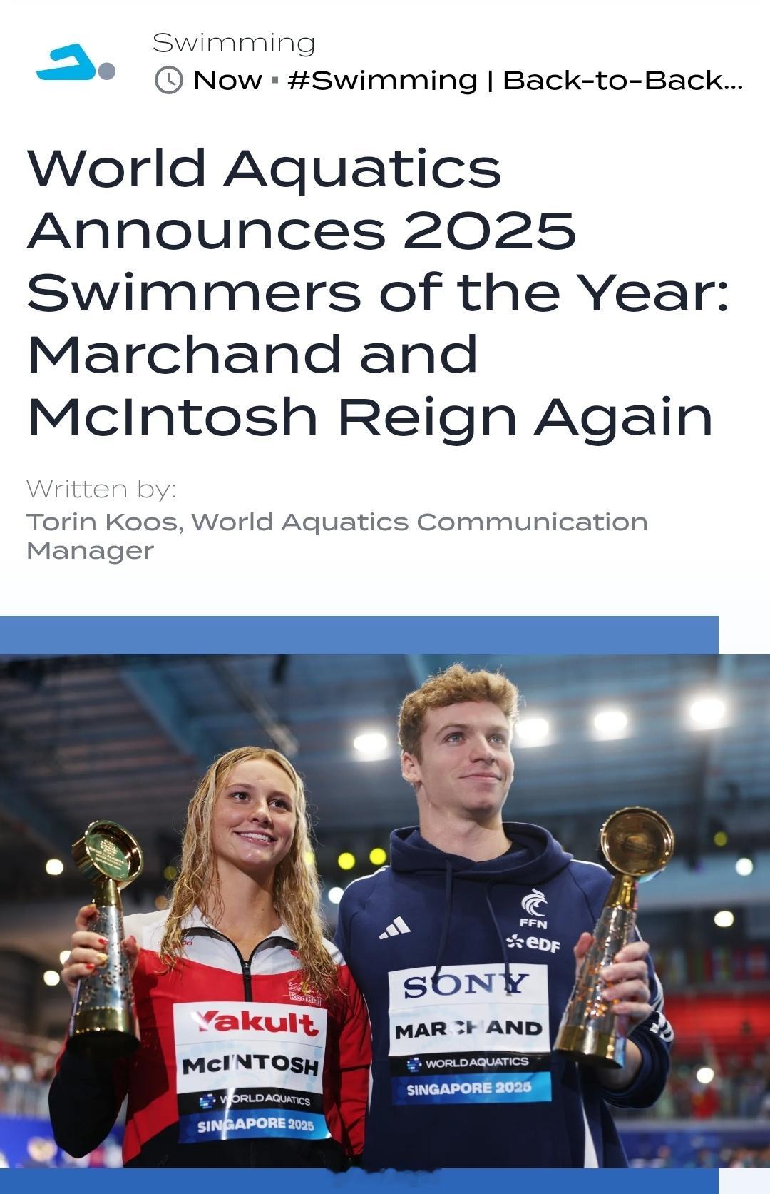 世界泳联年度最佳男/女游泳运动员🇫🇷Leon Marchand & 🇨🇦Summer McIntosh双双蝉联!恭喜!