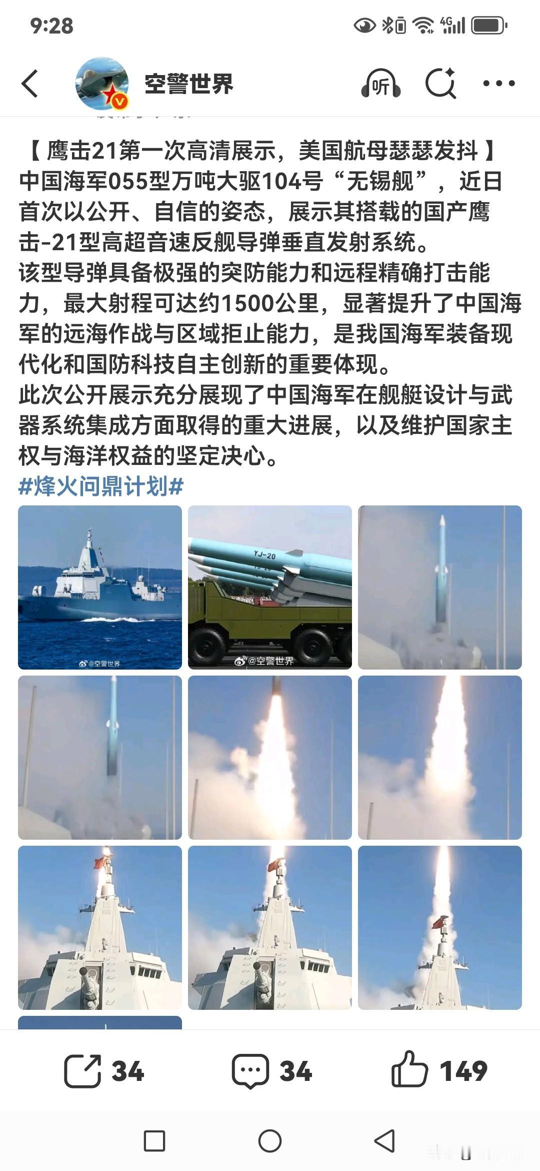 鹰击 21 第一次高清展示,这可太让人兴奋了!它就像一把悬在美国航母头上的利刃,让其瑟瑟发抖一点都不夸张。鹰击 21 有着超高的速度和强大的突防能力,能在极短时间内突破敌方防线。美国航母向来仗着自己的强大横行霸道,可遇到鹰击 21 就歇菜了。想象一下,只要鹰击 21 出手,美国航母那些所谓的防御体系可能瞬间就被撕开。这次高清展示,也是在向世界宣告我们的军事实力,警告那些心怀不轨的家伙,别轻易来挑衅,不然有他们好受的! 鹰击-21导弹 鹰击-19导弹 鹰击一弹道导弹 鹰击导弹 中国鹰击21 鹰击-18导弹 鹰击18导弹