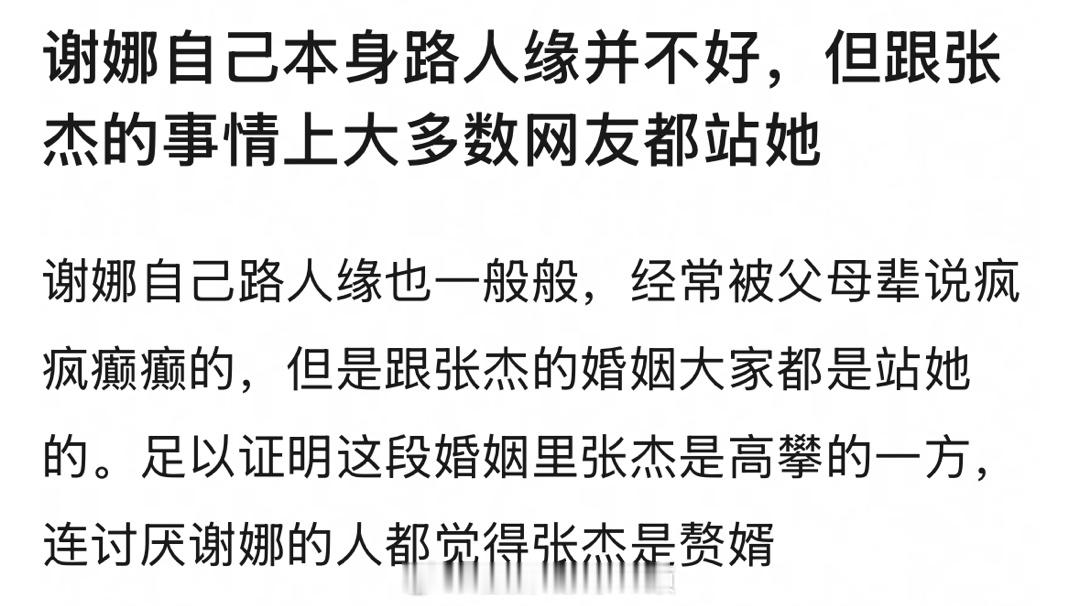谢娜自己本身路人缘并不好,但跟张杰的事情上大多数网友都站她,是这样吗?