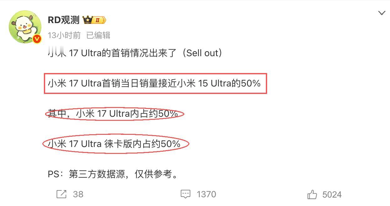 看了一下小米17Ultra的首销数据,貌似并不是那么理想! 小米17Ultra系列的首销数据只有小米15Ultra的一半(小米15Ultra首销数据不错,比15Ultra销量提升不少)。 而小米17Ultra对比小米15Ultra,首销数据相当于腰斩了。 不过好的是,小米17Ultra徕卡版本和普通版本各占一半(看来一半的17U用户追求实用,而另一半则是对徕卡的情绪价值付费)。 一方面,17Ultra跟上一代15Ultra在外观上没有啥改变,所以消费者的换机欲望没那么强烈(看看iiPhone17Pro系列和小米17Pro系列,都是因为改了设计走量不少)。 另一方面,去年的小米SU7给小米带来不少流量和正向宣传,拔高了小米这个品牌,所以小米15Ultra的销量高跟这个也有一定关系(小米15Ultra是和小米su7 Ultra一起发布的,关注度更高)。 但是今年小米和雷军的小字营销带来了不少影响,再加上改名17颇具争议,再结合今年的机圈市场,下滑也是理所当然。但是首销居然腰斩,这个数据量倒是有点意外。 当然,或许跟涨价500也有一定关系,毕竟七八千这个段位,除了华为Mate80系列外,iPhone17更是这个价位段的王者。换句话说,价格越接近iPhone的高端机,安卓的高端机没有价格优势就越容易被取代。