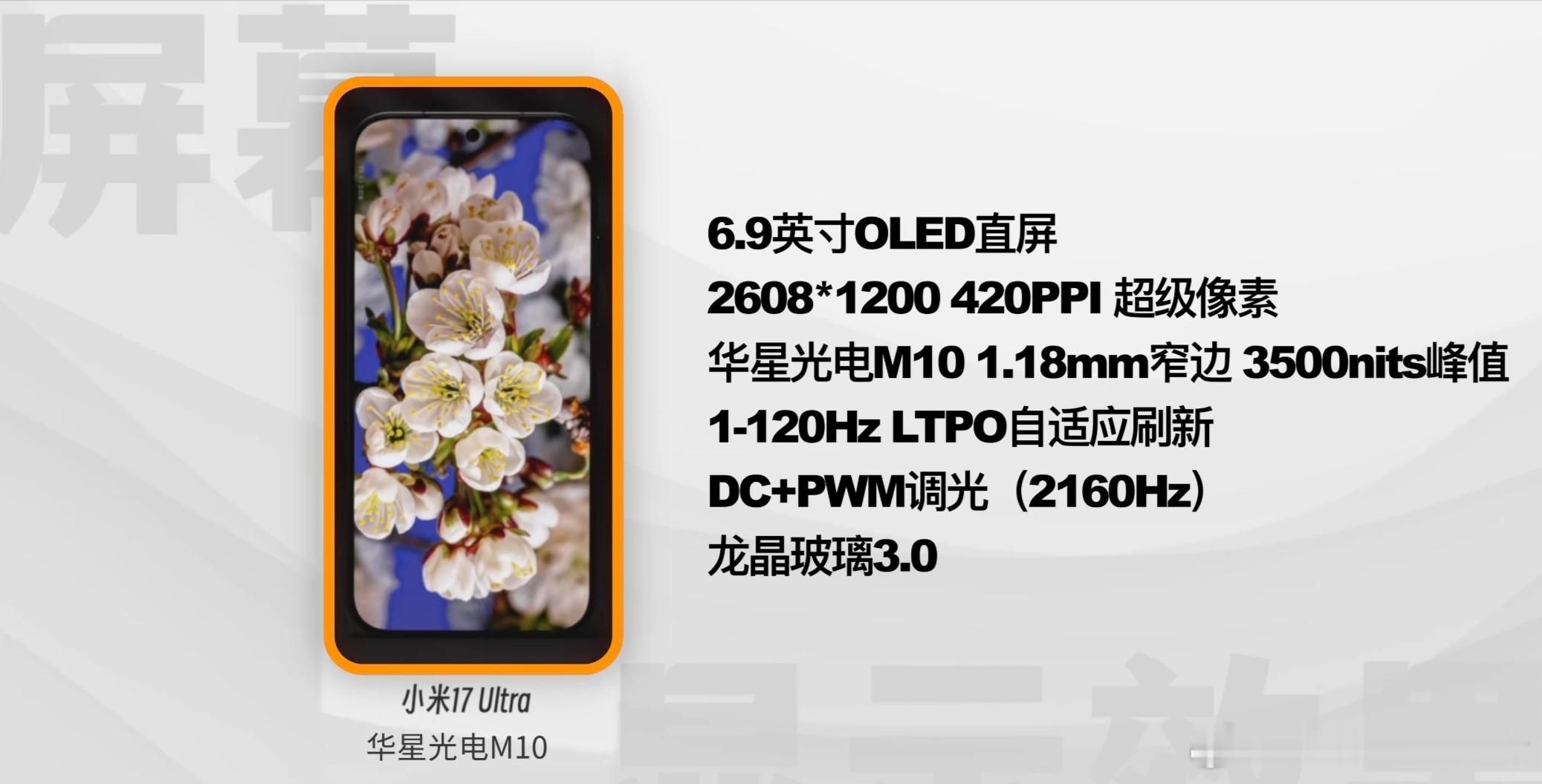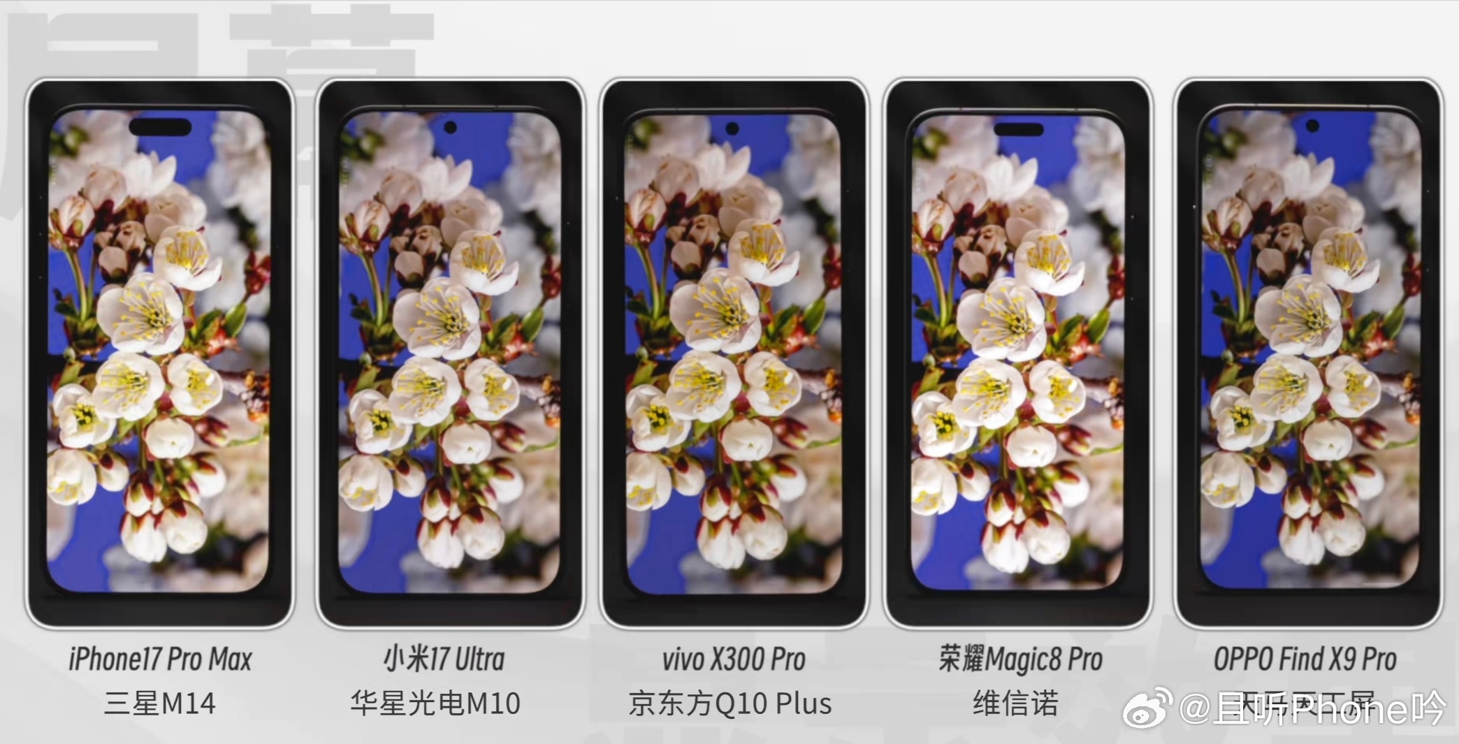 今年果米OV耀五家旗舰的屏幕,正好来自五家不同的供应商,都是各家最强的产品。第一款Ultra,米17U的屏幕依然是米17PM同款的华星M10 超级像素。显示效果也基本相同,单看的效果相比前几代的华星屏,显示的细腻程度、通透度提升都很明显。和其它几家的Pro放在对比(图2),表现也不错,但和最顶iPhone还有差距。不过这次边框是真的窄,正面颜值很高。默认模式下的饱和度有点偏高,不习惯的可以手动调一下。PS:今年各家国产屏都有大提升,不止华星光电,天马以及维信诺提升也很明显,再加上一直是国产顶级的京东方,明年屏幕继续升级,看看别家Ultra的表现了。初中生万元手机被网友带着换二手