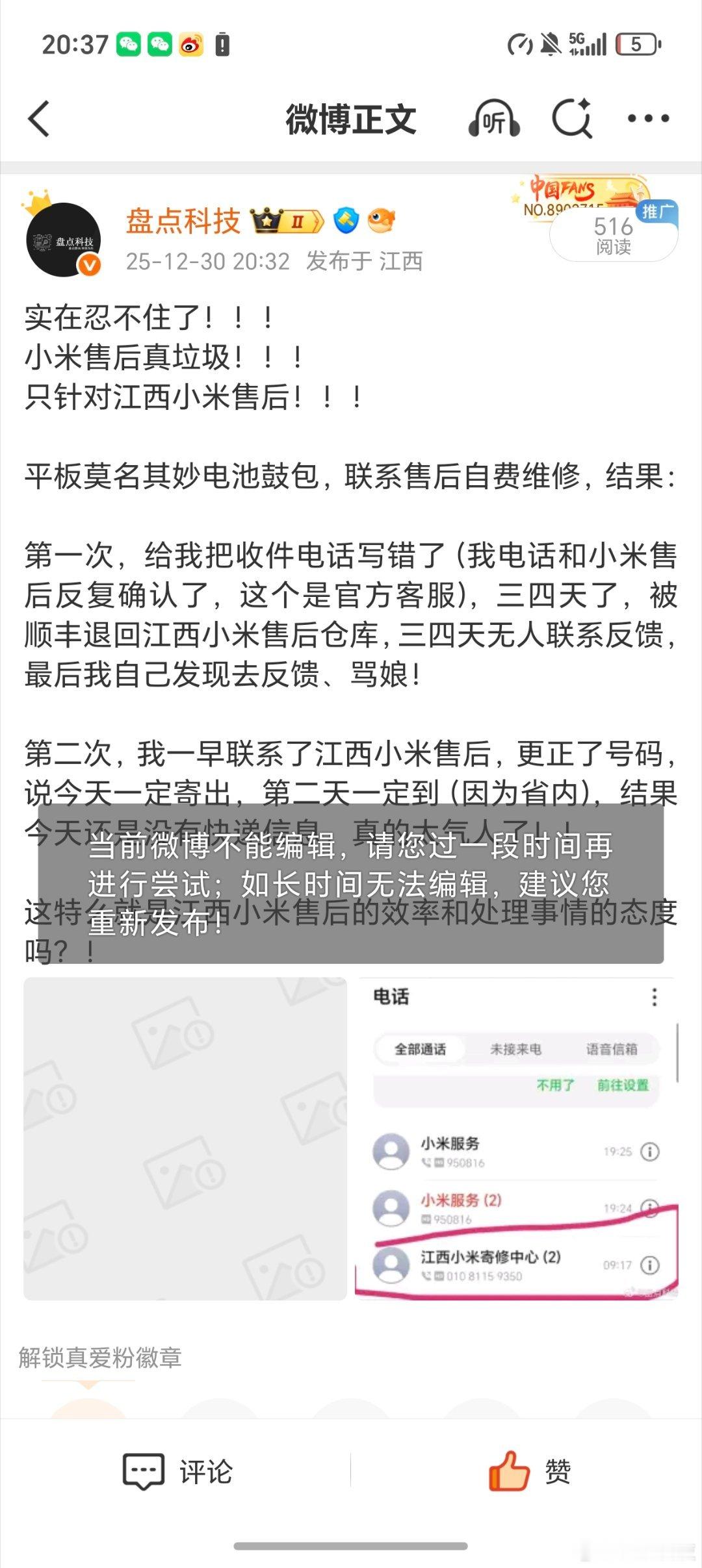 (图一发了被限流了,可能是措辞太过激了,来个温柔版)实在忍不住了!!!小米售后真让人失望!!!只针对江西小米售后!!!平板莫名其妙电池鼓包,联系售后自费维修,结果:第一次,给我把收件电话写错了(我电话和小米售后反复确认了,这个是官方客服),三四天了,被顺丰退回江西小米售后仓库,居然过了三四天无人联系反馈?!最后还是我自己发现去反馈、投诉!第二次,我一早联系了江西小米售后(9点到现在将近12小时),更正了号码,说今天一定寄出,第二天一定到(因为省内),他们给出了肯定的答复,结果到目前为止仍然还没有快递信息,真的太气人了!!这就是江西小米售后的效率和处理事情的态度吗?!没人管了吗?