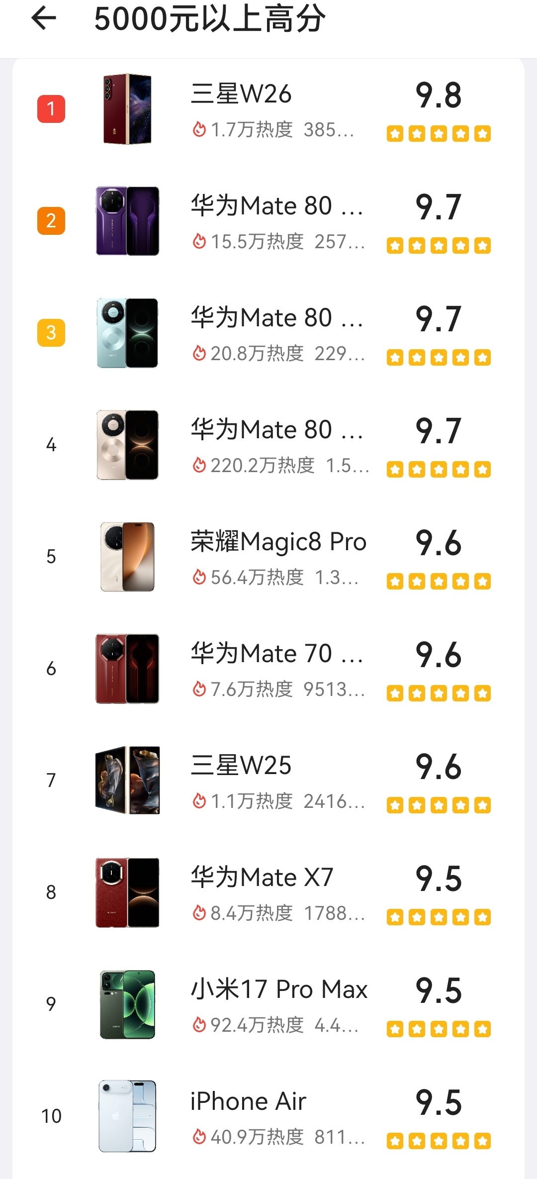 酷安的旗舰机机主评分华为Mate80系列的三款机型均排在前五,荣耀Magic8Pro也在第五。这几个排名倒不意外,比较意外的是三星W26竟然以9.8的高分排在第一。
