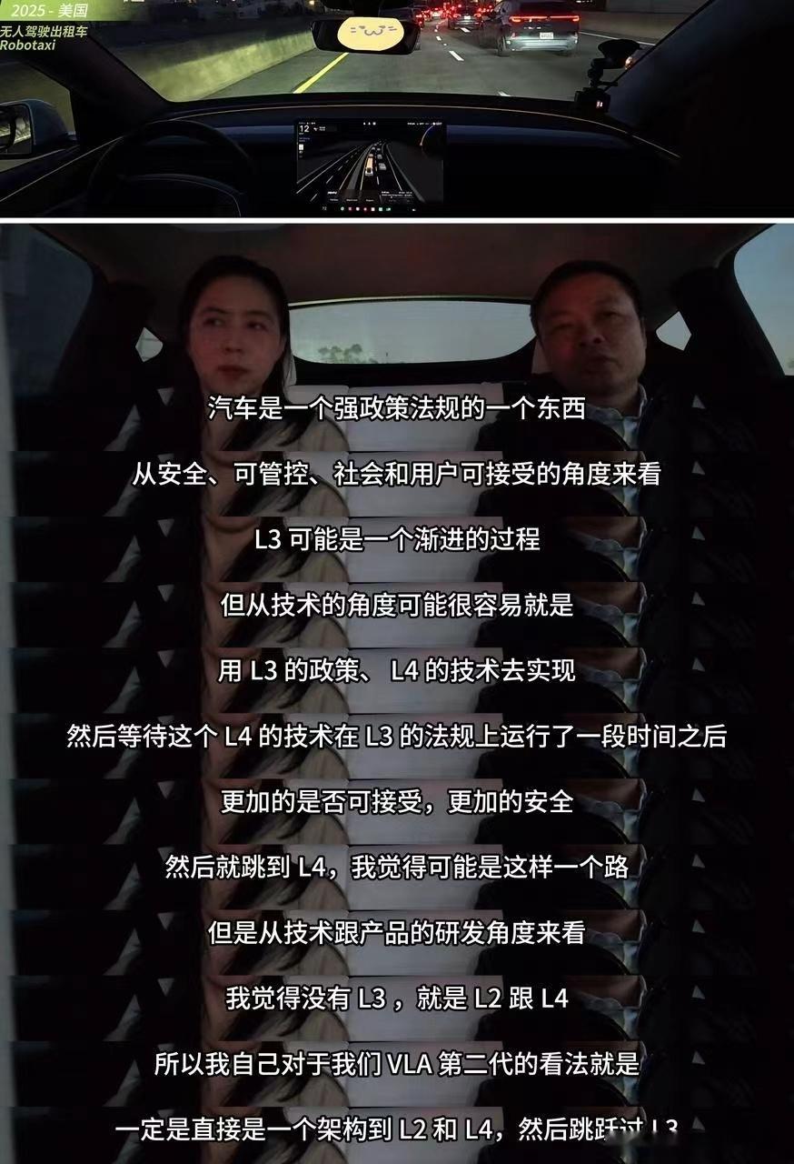 大师兄去美国体验特斯拉最新的FSD V14了~他的两个感受还挺有意思,分享给大家:1. 特斯拉用一套系统架构同时覆盖了Robotaxi和FSD,从适配更多场景的角度来看,这套方案感觉比目前谷歌Waymo的方案更具优势。(这让人想起此前Waymo曾出现的大规模系统瘫痪事件)2. 技术层面,大师兄认为FSD V14实现了跃进式突破——直接从L2跨越到L4级别,L3更像是法规层面的过渡状态。(毕竟L3定义为“有条件自动驾驶”,车企在规划技术方案时,不太可能局限于特定场景做针对性开发,更大概率会朝着L4、L5的全场景自动驾驶方向推进)何小鹏9大场景美国对比特斯拉小鹏和特斯拉将共同加速全球L4进程何小鹏邀请马斯克明年PK